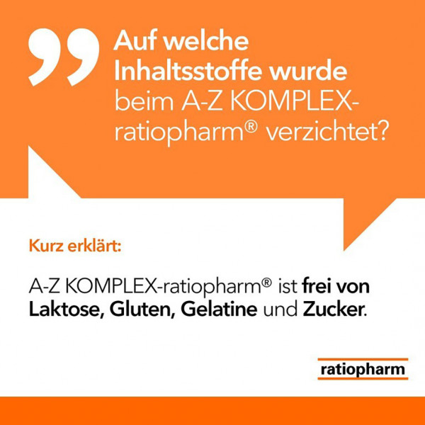 Damit unser Körper gut funktionieren kann, müssen ihm Vitamine, Mineralstoffe und Spurenelemente in ausreichender Menge zur Verfügung stehen. A-Z-KOMPLEX ratiopharm® ist ein Nahrungsergänzungsmittel, das eine Versorgung mit den wichtigsten Vitalstoffen sicherstellt. Es enthält alle Vitamine plus 10 Mineralstoffe und Spurenelemente. Die Tabletten sind frei von Laktose, Gluten, Zucker und Gelatine. A-Z-KOMPLEX ratiopharm® ist eine Vitalstoff-Kombination zur Rundumversorgung, mit der sich der tägliche Bedarf an allen Vitaminen und den wichtigsten Mineralstoffen schnell decken lässt. Aufgrund der Zusammensetzung ist die Einnahme von einer Tablette täglich ausreichend. A-Z-KOMPLEX ratiopharm®: gut versorgt von A-Z.