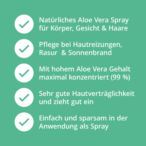 Das leichte Aloe Vera Spray versorgt trockene und gereizte Haut mit besonders viel und ausgezeichnet verträglicher Feuchtigkeit. So haben kleine Fältchen keine Chance. Die Haut wird von innen heraus aufgepolstert, zart und geschmeidig. Außerdem ist das Aloe Vera Spray eine ideale After Sun Pflege!