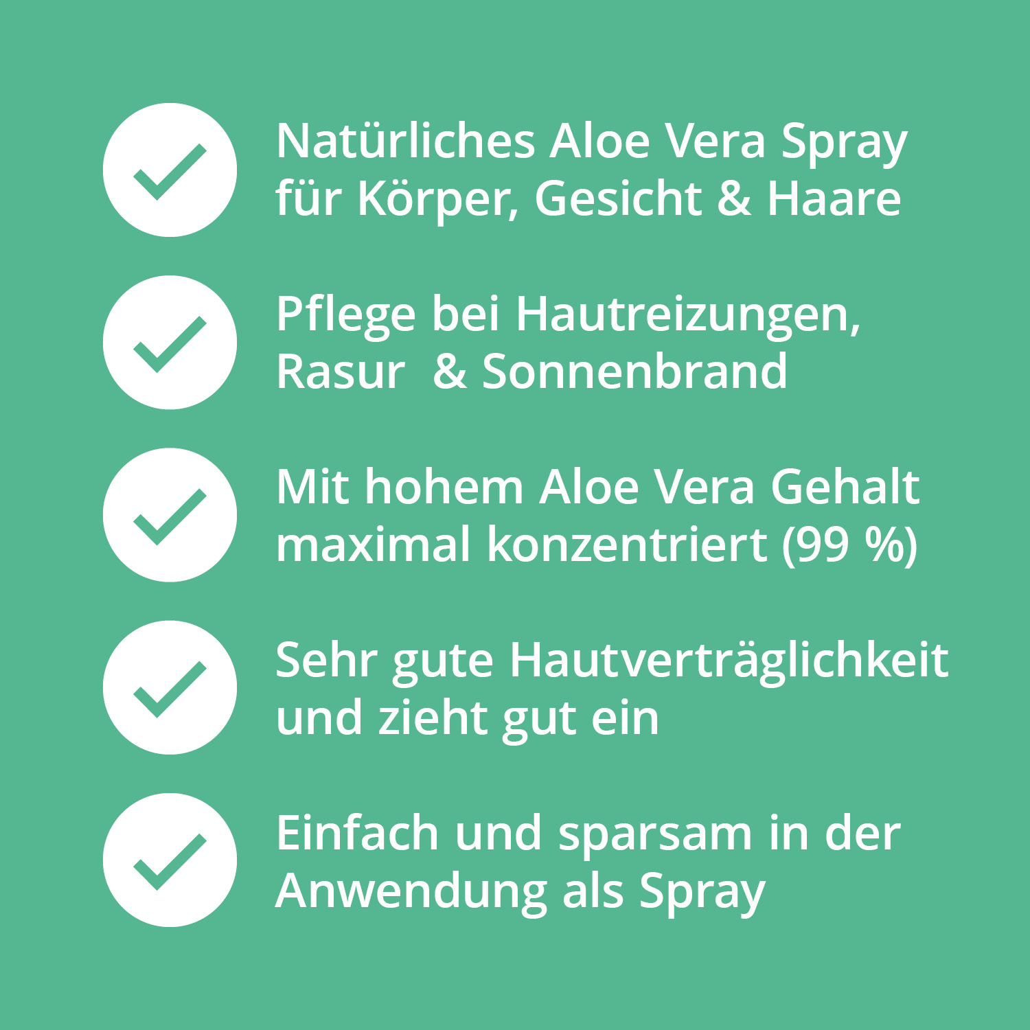 Das praktische Aloe Vera Spray mehrmals täglich auf Haut und Haare aufsprühen.