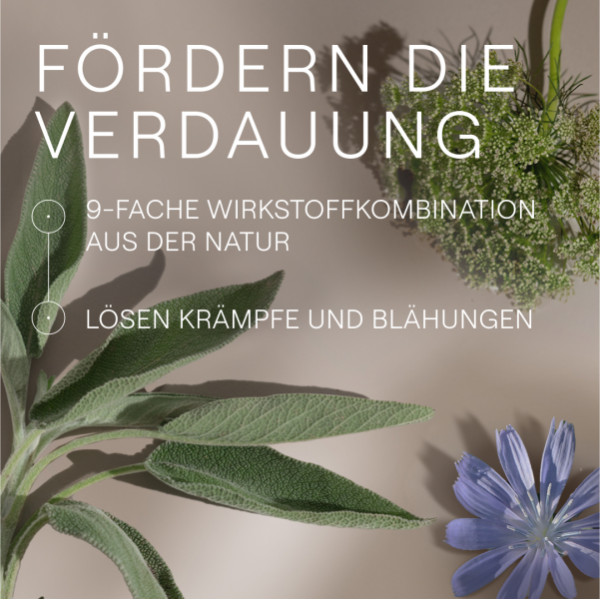 10 g (= 10,4 ml) enthalten: Wirkstoffe: 0,15 g ethanol. Auszug aus Artemisia absinthium, Herba rec. (1:2,3)/0,075 g ethanol. Auszug aus Centaurium erythraea, Herba rec. (1:2,3)/0,6 g ethanol. Auszug aus Cichorium intybus, Planta tota rec. (1:2,3)/Gentiana lutea, ethanol. Decoctum Ø 0,36 g/Juniperus communis, Summitates, ethanol. Infusum Ø (HAB, V. 20) 0,05 g/Millefolii herba, ethanol. Infusum Ø (HAB, V. 20) 2,0 g/0,15 g ethanol. Decoctum aus Peucedanum ostruthium, Rhizoma rec. (1:2,15)/Salvia officinalis, ethanol. Infusum Ø 1,0 g/Taraxacum Ø 0,32 g.