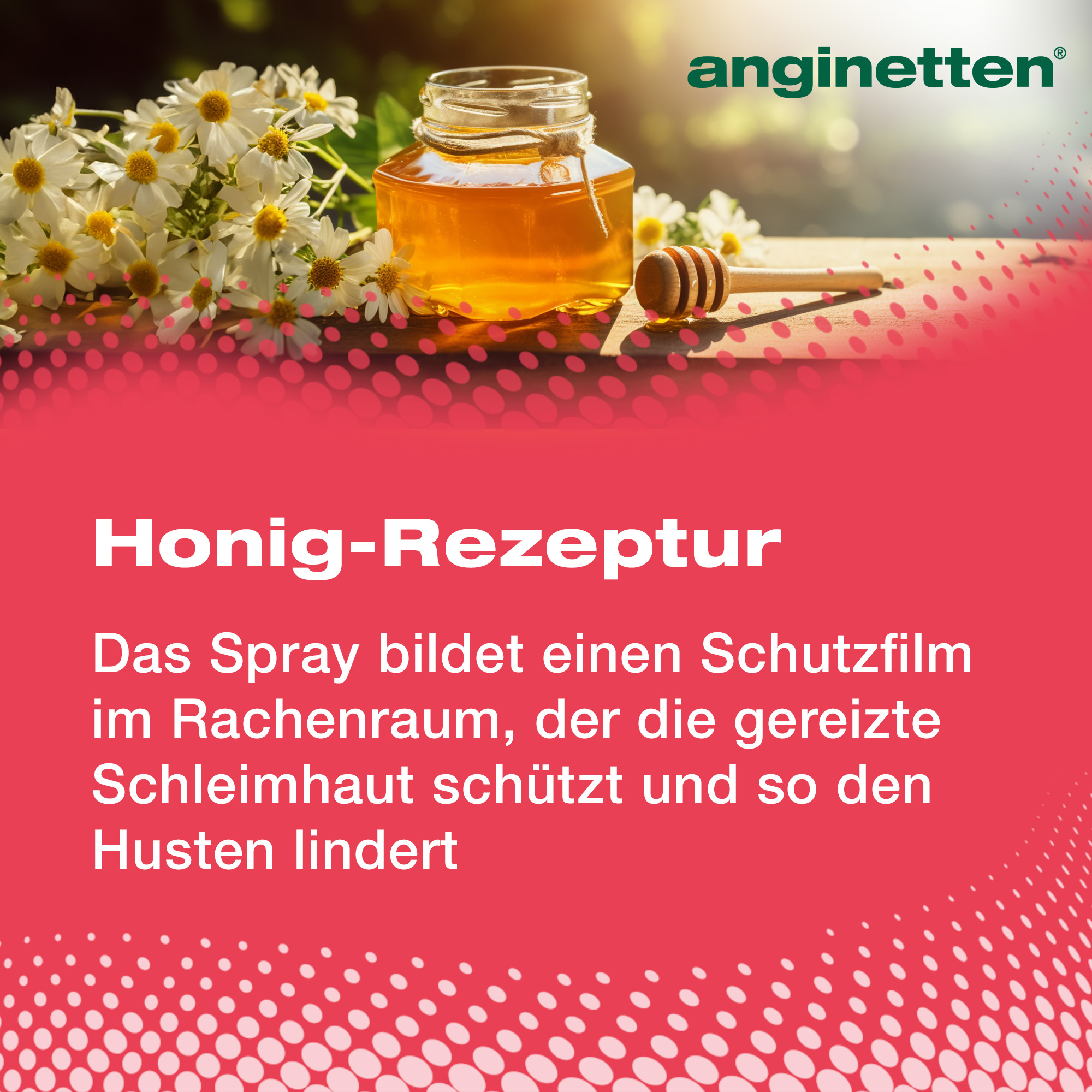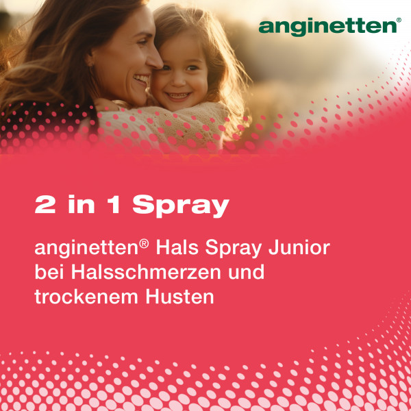 Das anginetten® Hals Spray junior ist ein Medizinprodukt mit einer Honig-Rezeptur zur Beruhigung von Husten und zur Linderung von Halsschmerzsymptomen. Das Spray bildet einen Schutzfilm im Rachenraum, der die gereizte Schmleimhaut schützt und so den Husten lindert. Das anginetten® Hals Spray junior kann von Erwachsenen und Kindern ab 3 Jahren verwendet werden.