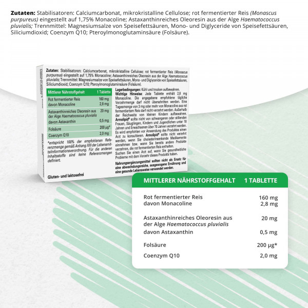 Stabilisatoren: Dicalciumphosphat und mikrokristalline Cellulose, pulverisierter rot fermentierter Reis (25%), astaxanthinhaltige getrocknete Grünalgen (Haemotococcus pluvialis) (2,5%), Trennmittel: Magnesiumsalze von Speisefettsäuren, Mono- und Diglyceride von Speisefettsäuren und Siliciumdioxid, Coenzym Q10 (0,25%), Pteroylmonoglutaminsäure (Folsäure).