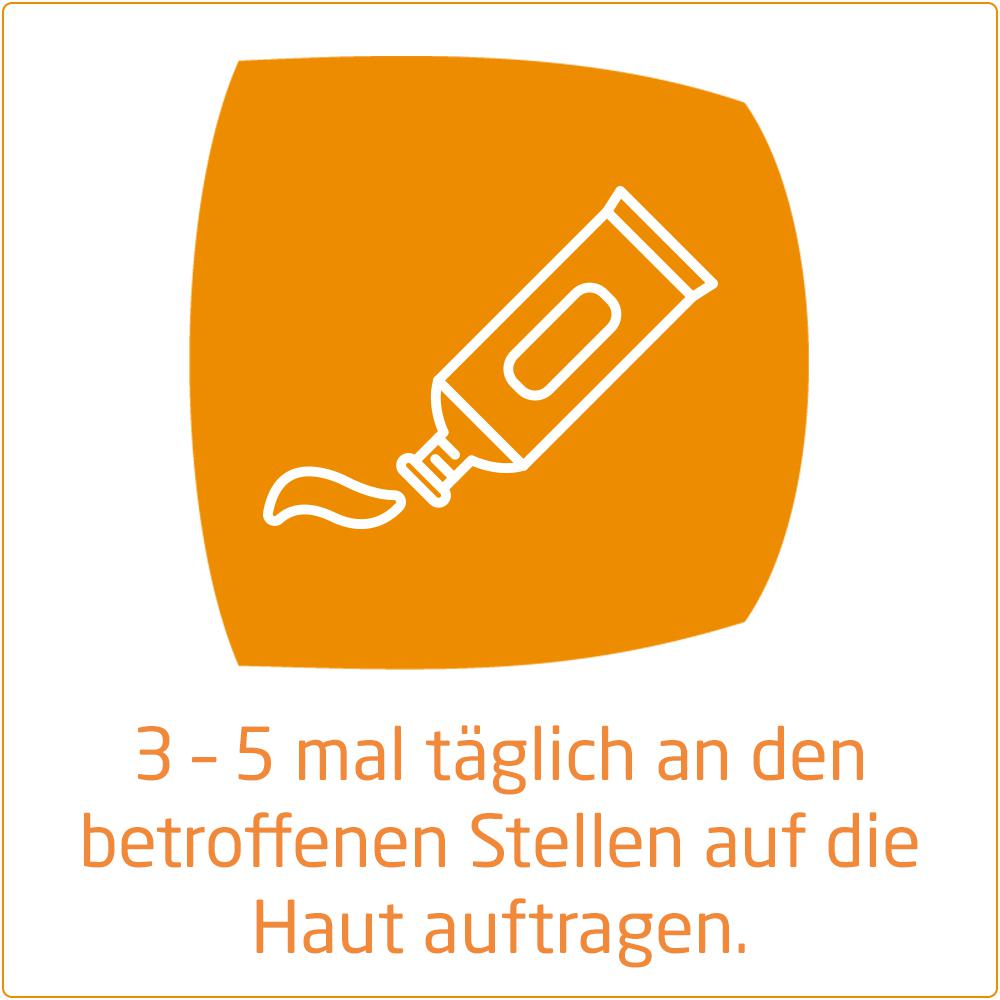 Soweit nicht anders verordnet, 3 – 5 mal täglich an den betroffenen Stellen auf die Haut auftragen.