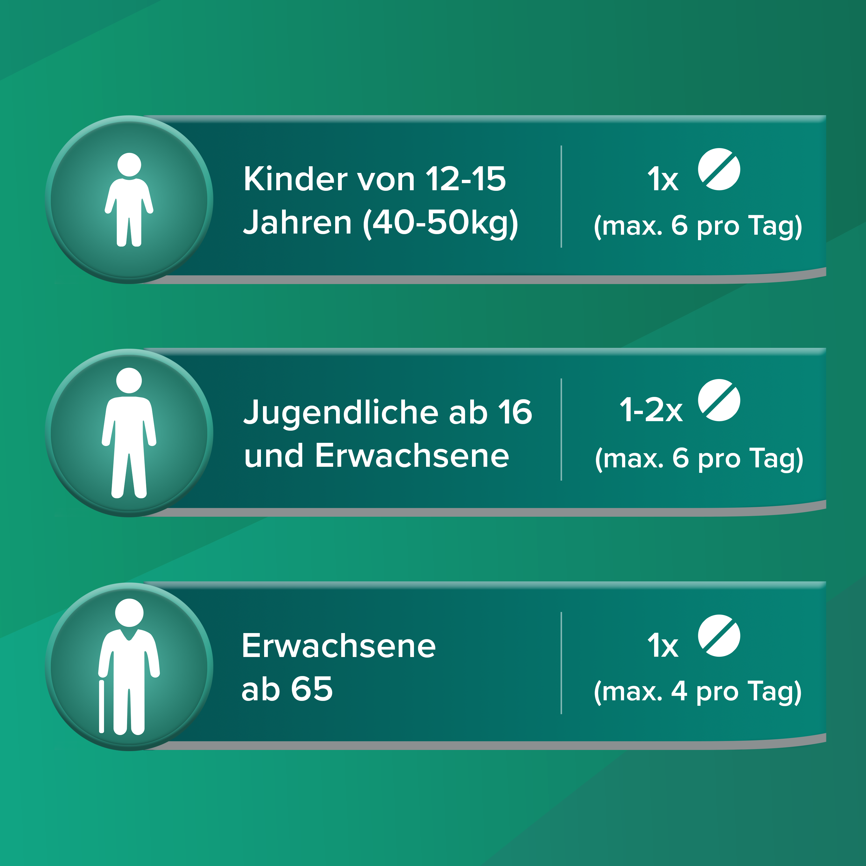 Erwachsene ab 65 Jahren 1 Tablette 1-4 mal täglich (max. 4 Tabletten pro Tag) im Abstand von mindestens 4 Stunden, nach der Mahlzeit