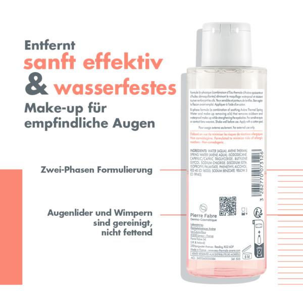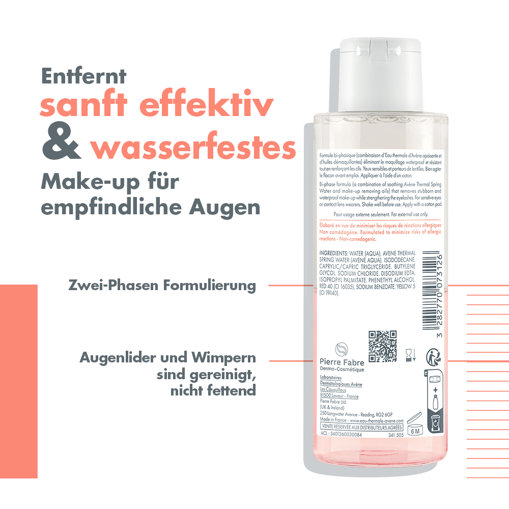 Der Avène Augen-Make-up-Entferner für wasserfestes Augen-Make-up entfernt sanft Make-up, beruhigt die Haut und ist besonders für empfindliche Augen, KontaktlinsenträgerInnen und gereizte Augenlider geeignet.