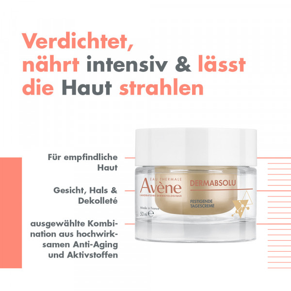 Die Avène DERMABSOLU festigende Tagescreme unterstützt die Haut beim Kampf gegen die sichtbaren Zeichen der Hautalterung und definiert die Gesichtskonturen neu, dank des dermatologischen Aktivstofftrios: