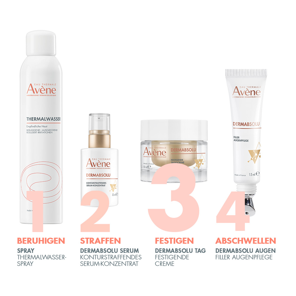Avène DERMABSOLU wirkt 3 klinischen Zeichen der Hautalterung entgegen: Die Gesichtskonturen werden gestrafft, die Haut wird intensiv genährt, und der Teint ist strahlend.