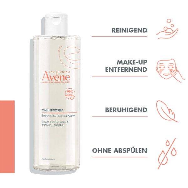 Dieses Mizellenwasser reinigt (sogar Verschmutzungspartikel*), spendet Feuchtigkeit** und beruhigt empfindliche Gesichts- und Augenpartien in einem einfachen Schritt. Sie enthält 99 % Inhaltsstoffe natürlichen Ursprungs und keine tierischen Bestandteile. Macht die Haut klar, weich, beruhigt und sorgt für Wohlbefinden. Täglich entfernt dieses zart duftende Mizellenwasser Make-up und schenkt Geschmeidigkeit in einem einfachen und schnellen Schritt. Es verbessert die Feuchtigkeitszufuhr und bewahrt das natürliche Gleichgewicht der Haut dank der Kombination von Glycerin und Trehalose und der hohen Konzentration des Avène Thermalwassers mit seinen beruhigenden Eigenschaften. Seine Formulierung enthält ein Minimum an Aktivstoffen in genau der richtigen Dosierung, um Wirksamkeit und Verträglichkeit zu gewährleisten***. Die ökologisch gestaltete Flasche besteht aus recyceltem Kunststoff****und kann wiederverwertet werden. Das Mizellenwasser zum Entfernen von Make-up ist für Kontaktlinsenträger geeignet. Die 400ml-Verpackung des Mizellenwassers zum Entfernen von Make-up besteht zu 87 % aus recycelten Materialien. Die Flasche besteht aus 100 % recyceltem Kunststoff****. * Bewertung der Menge der nach einer einmaligen Anwendung verbleibenden Mikropartikel bei 27 Probanden ** obere Hautschichten *** Monozentrische Studie an 32 Probanden mit empfindlicher Haut und Augen, zweimal täglich auf Gesicht, Augen, Lippen und Dekolleté aufgetragen **** ohne Kappe