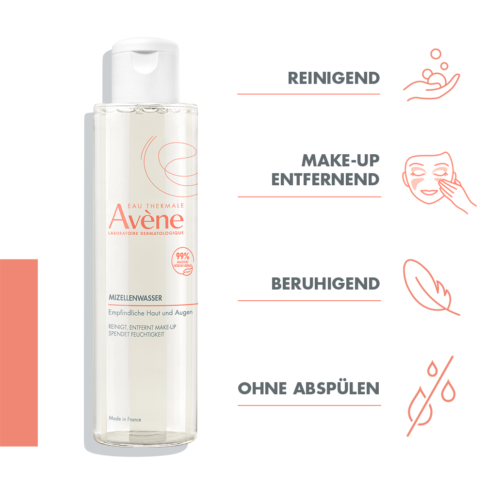 Dieses Mizellenwasser reinigt (sogar Verschmutzungspartikel*), spendet Feuchtigkeit** und beruhigt empfindliche Gesichts- und Augenpartien in einem einfachen Schritt. Sie enthält 99 % Inhaltsstoffe natürlichen Ursprungs und keine tierischen Bestandteile. Macht die Haut klar, weich, beruhigt und sorgt für Wohlbefinden. Täglich entfernt dieses zart duftende Mizellenwasser Make-up und schenkt Geschmeidigkeit in einem einfachen und schnellen Schritt. Es verbessert die Feuchtigkeitszufuhr und bewahrt das natürliche Gleichgewicht der Haut dank der Kombination von Glycerin und Trehalose und der hohen Konzentration des Avène Thermalwassers mit seinen beruhigenden Eigenschaften. Seine Formulierung enthält ein Minimum an Aktivstoffen in genau der richtigen Dosierung, um Wirksamkeit und Verträglichkeit zu gewährleisten***. Die ökologisch gestaltete Flasche besteht aus recyceltem Kunststoff****und kann wiederverwertet werden. Das Mizellenwasser zum Entfernen von Make-up ist für Kontaktlinsenträger geeignet. Die 400ml-Verpackung des Mizellenwassers zum Entfernen von Make-up besteht zu 87 % aus recycelten Materialien. Die Flasche besteht aus 100 % recyceltem Kunststoff****. * Bewertung der Menge der nach einer einmaligen Anwendung verbleibenden Mikropartikel bei 27 Probanden ** obere Hautschichten *** Monozentrische Studie an 32 Probanden mit empfindlicher Haut und Augen, zweimal täglich auf Gesicht, Augen, Lippen und Dekolleté aufgetragen **** ohne Kappe