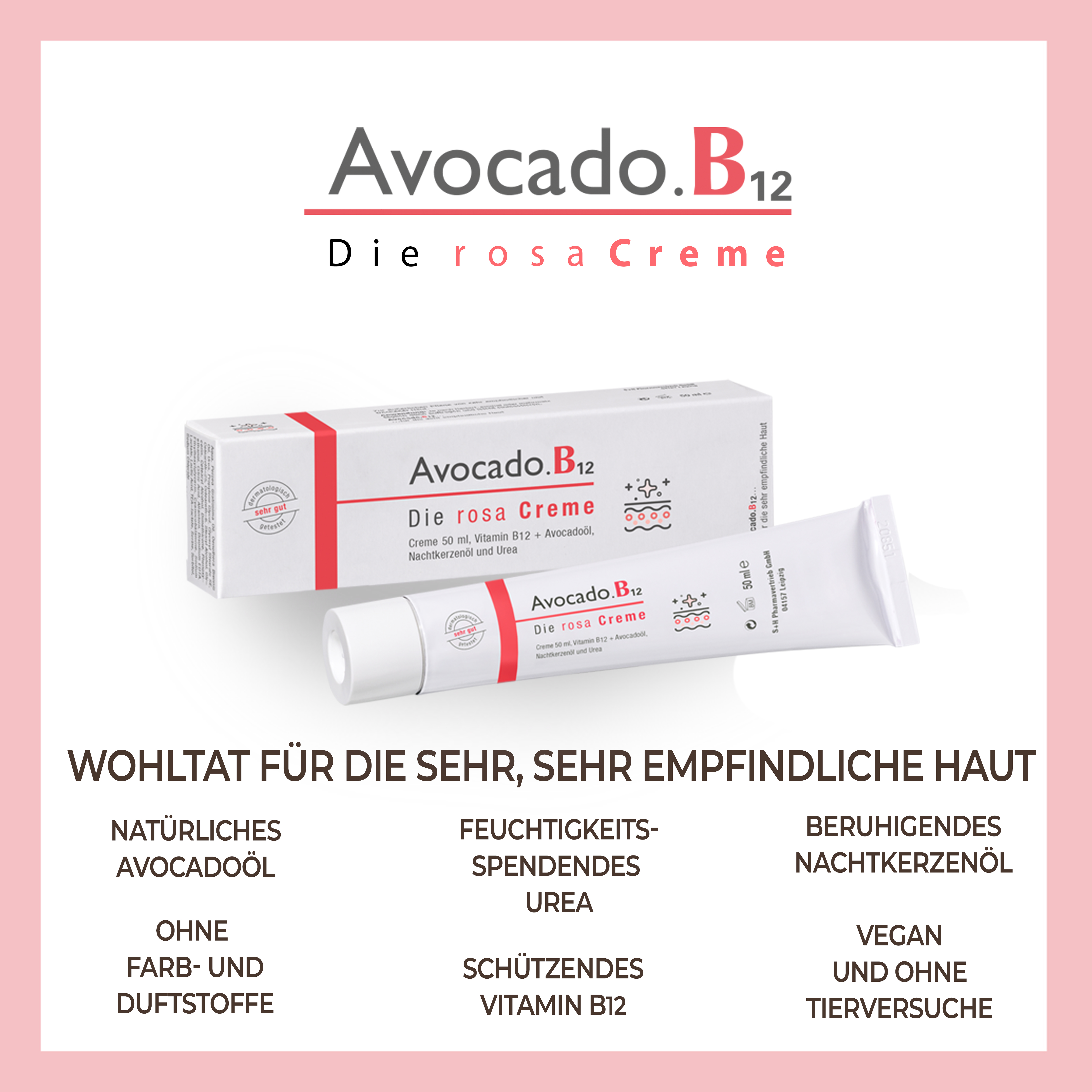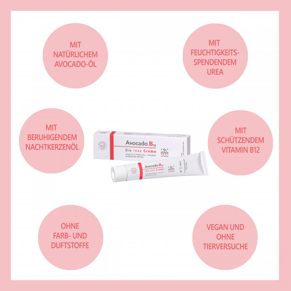 Avocado.B12 – Die rosa Creme ist eine besonders sanfte Hautpfl ege, die mit Avocadoöl, Nachtkerzenöl und Vitamin B12 in einer einzigartigen Galenik die Hautregeneration fördert, Feuchtigkeitsverlust vermindert