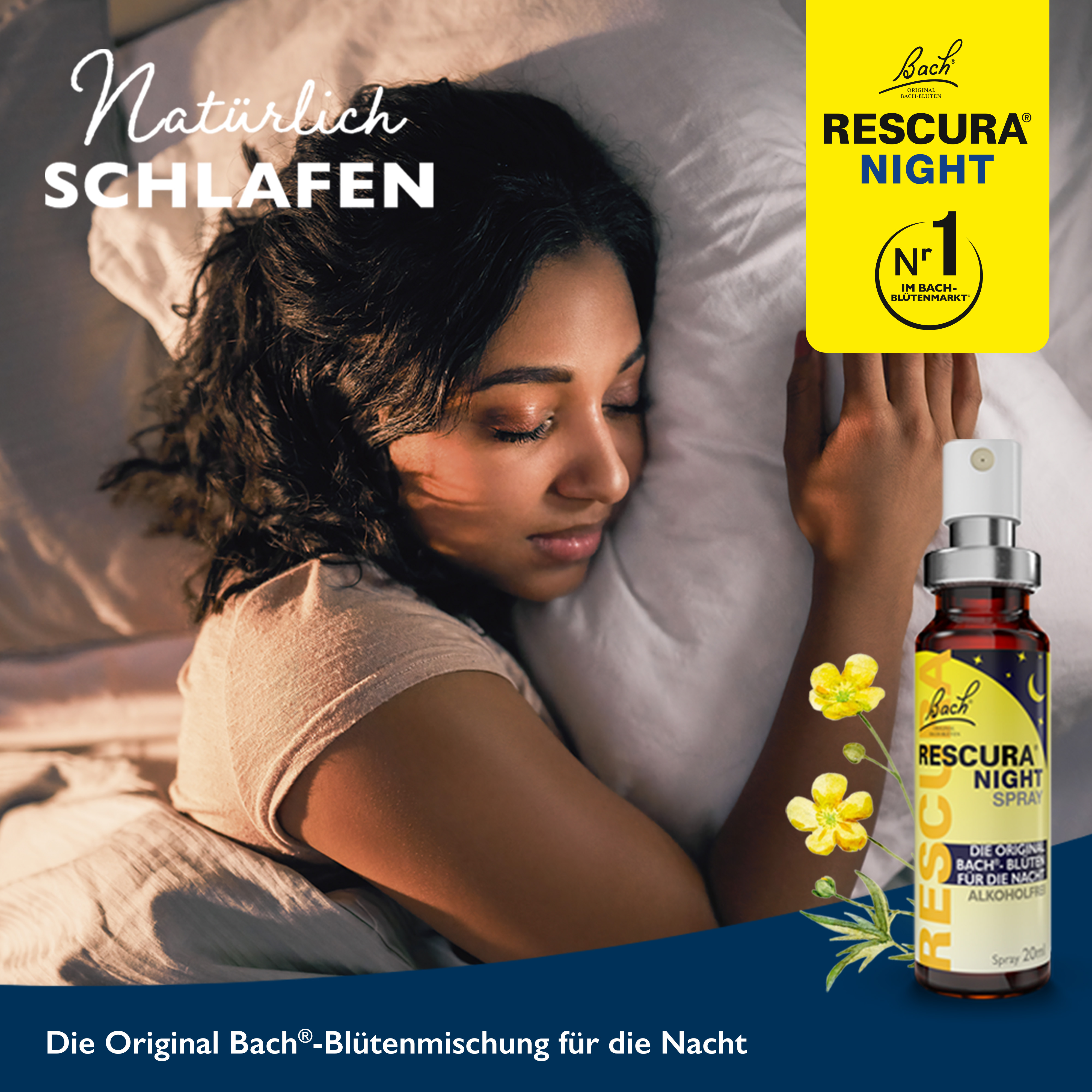 Man sollte sich nicht mit Schlaflosigkeit abgeben! Eine erholsame Nacht ist wichtig, um morgens frisch in den Tag zu starten. Deshalb gilt: Aufhören zu grübeln, zu Bach RESCURA® NIGHT Spray gegen Schlaflosigkeit greifen und sich auf eine erholsame Nacht freuen. Die bewährten fünf Original Bach®-Blütenessenzen ergänzt um die Bachblüte White Chestnut, die dabei hilft vor dem Schlafen zur Ruhe zu kommen. Für alle die ein melatoninfreies Produkt bevorzugen. Vor bereits über 90 Jahren entwickelte Edward Bach das System der 38 Bachblüten. Diese werden bis heute in ihrer ursprünglichen Form als die Original Bach®-Blüten weitergeführt. Die Bach RESCURA® Tropfen enthalten die Original Bach®-Blütenmischung - Edward Bach's berühmte Kombination aus 5 Bachblüten Tropfen. Natürlich und ohne Nebenwirkungen. Keine chemischen Zusätze. Einfach anzuwenden. Laktosefrei. Vegan.