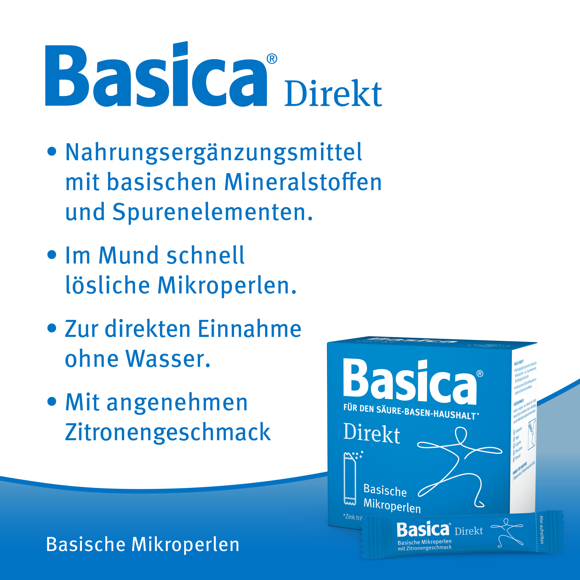Basica Direkt® ist ideal für die schnelle Einnahme zu Hause, unterwegs, im Büro oder beim Sport. Die basischen Mikroperlen schmecken erfrischend nach Zitrone und lösen sich schnell im Mund auf.