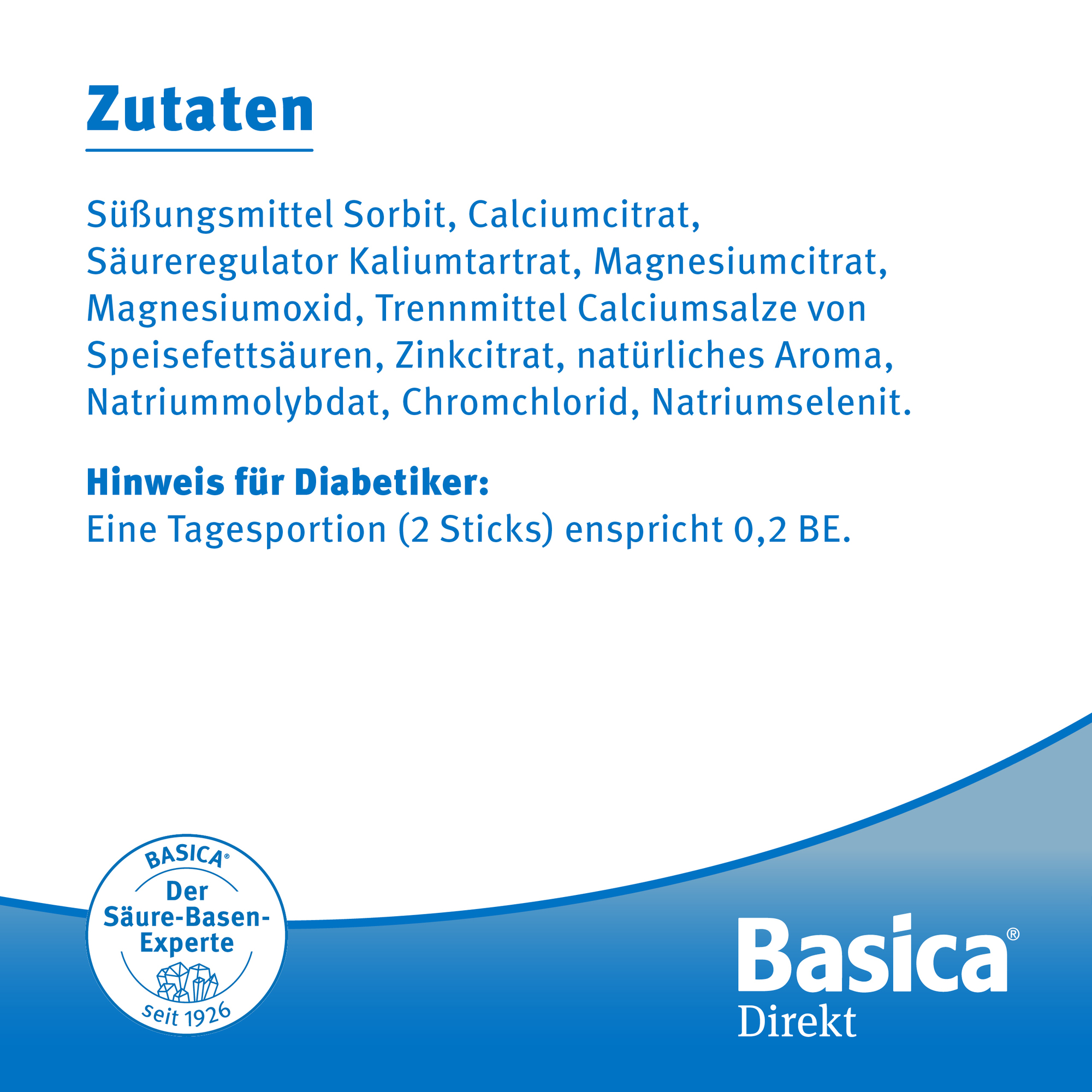Süßungsmittel Sorbit, Calciumcitrat, Säureregulator Kaliumtartrat, Magnesiumcitrat, Magnesiumoxid, Trennmittel Calciumsalze von Speisefettsäuren, Zinkcitrat, natürliches Aroma, Natriummolybdat, Chromchlorid, Natriumselenit