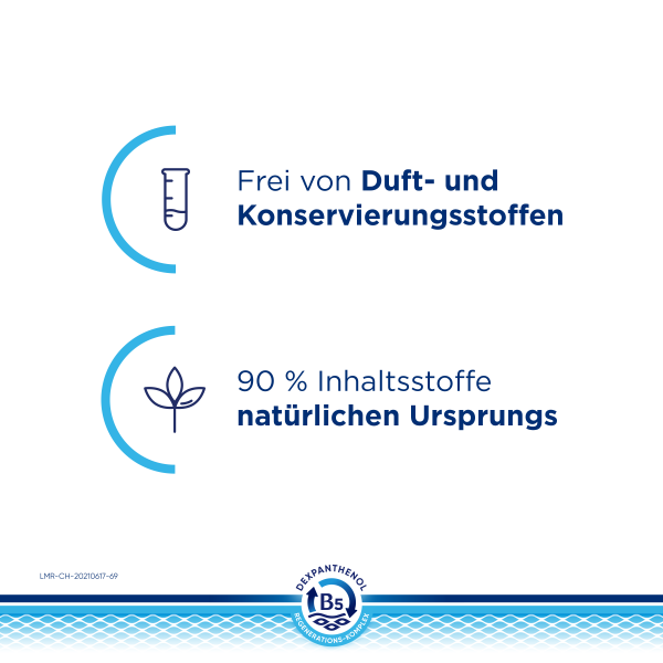 Der B5-Regenerations-Komplex unterstützt die Regeneration der Haut – von innen nach außen. Dabei fördert Dexpanthenol in tieferen Hautschichten der Epidermis die natürliche Zellregeneration. Das enthaltene Glycerin spendet sofortige und lang anhaltende Feuchtigkeit. Niacinamid (Vitamin B3) beruhigt juckende, trockene Haut und natürliche Lipide wie Sheabutter und Arganöl ergänzen fehlende Hautlipide. Das physiologische Lipid unterstützt zusätzlich die Anordnung der Doppellipidschicht.