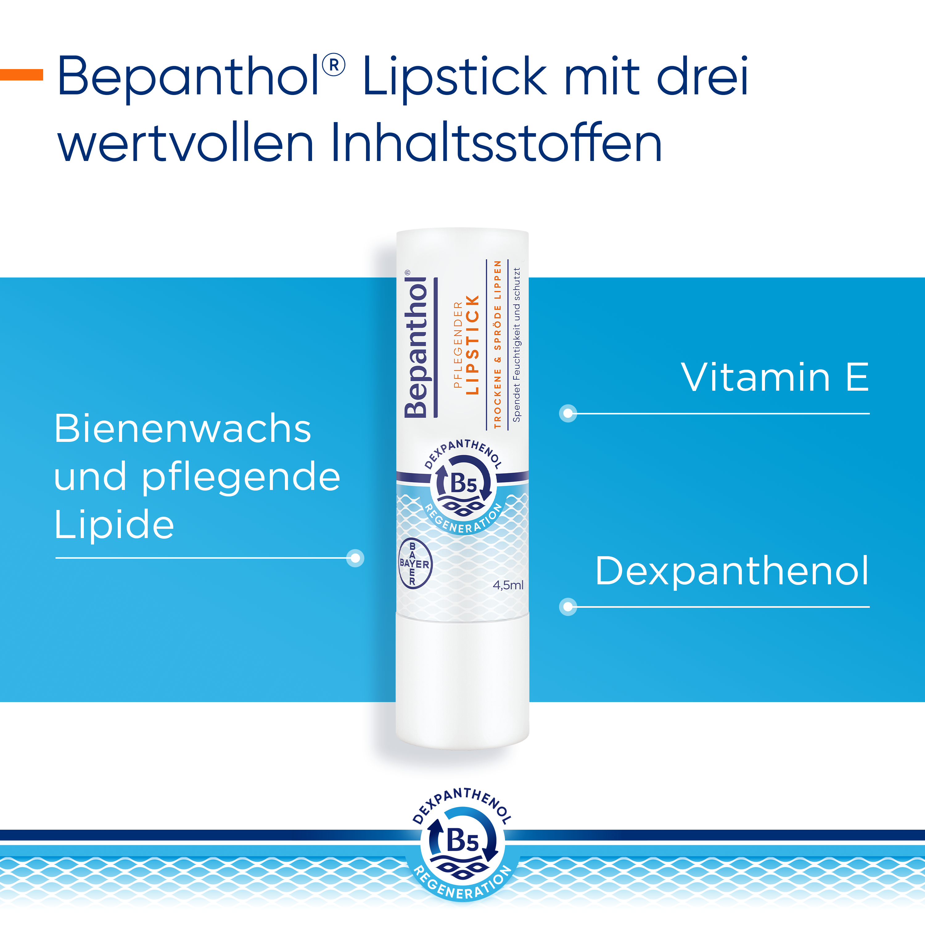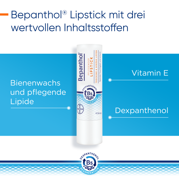 Erhältlich ist der Bepanthol® Pflegende Lipstick mit 4,5 Milliliter Inhalt. Sein praktisches Format und die einfache Anwendung machen ihn zu einem optimalen Begleiter für unterwegs.