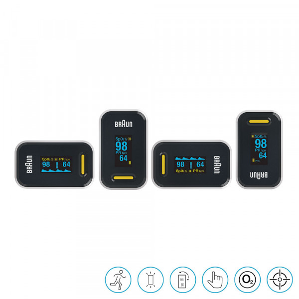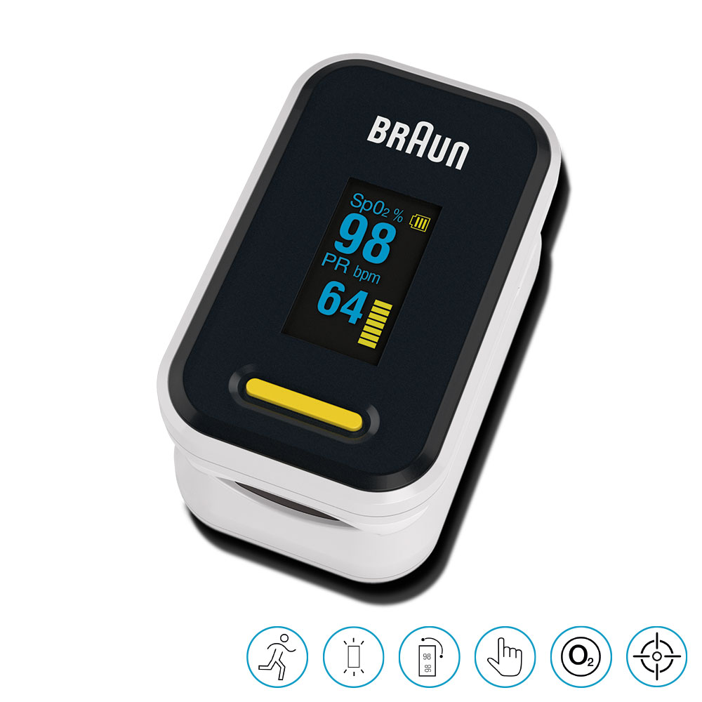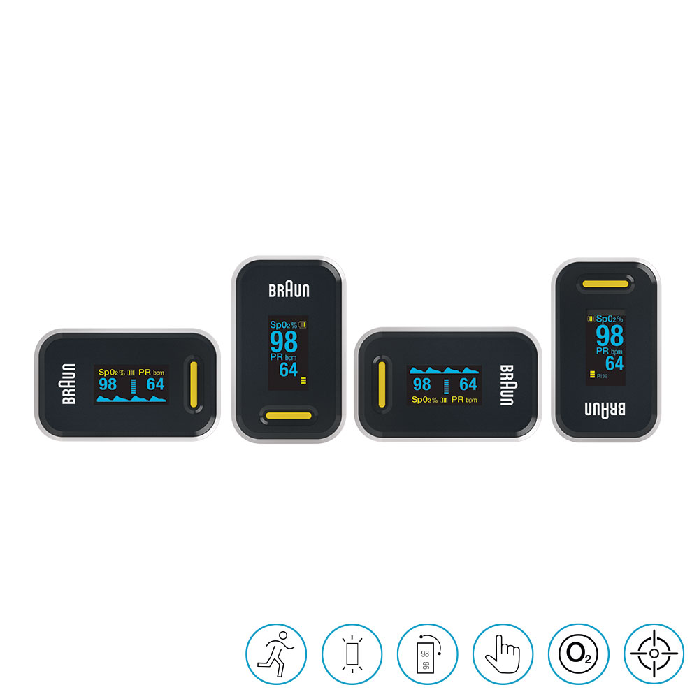 Atemwegserkrankung gehen meist mit einer verminderten Lungenfunktion einher, was zu einem niedrigeren Sauerstoffgehalt im Blut führen kann.  Wenn es für Sie wichtig ist, den Blutsauerstoffgehalt zu messen, ist das Braun Pulsoximeter 1 praktisch, klar und bequem. Messen Sie mit dem einfachen Finger-Clip mühelos und genau. Die Ergebnisse können sofort auf dem rotierenden OLED-Display mit Hintergrundbeleuchtung abgelesen werden. Mit dem praktischen Band können Sie es immer dabei haben.