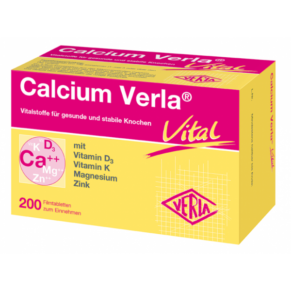 Deshalb ist es wichtig, frühzeitig etwas für die Knochengesundheit zu tun. Neben calciumreicher Ernährung und viel Bewegung sind ausgewählte Vitalstoffe besonders wichtig. In Calcium Verla® vital ist neben Calcium – dem wichtigsten Knochenbaustein – und Vitamin D3, dem Calciumeinbauhelfer, das "knochenspezifische" Vitamin K enthalten. Dieses aktiviert den Eiweißstoff Osteocalcin, der wichtige Funktionen im Knochenstoffwechsel ausübt. Für dessen Bildung ist wiederum Vitamin D notwendig. Deshalb sind die Vitamine K und D wichtige Partner, die sich in ihrer Wirkung gegenseitig ergänzen und für den Knochenstoffwechsel unverzichtbar sind. Der Mineralstoff Magnesium ist als wesentlicher Bestandteil der mineralischen Knochensubstanz wichtig für die Knochenfestigkeit. Das Spurenelement Zink ist zum einen fester Bestandteil der Knochensubstanz, zum anderen übt es im Knochenstoffwechsel wichtige Funktionen aus. Zudem wird Zink für die Regulation des Säure-Basen-Haushalts benötigt.