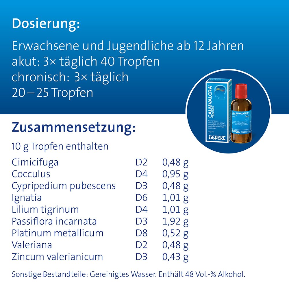 Calmvalera Tropfen enthalten mit dem „Calm-9-Komplex“ eine bewährte Kombination aus neun sorgfältig ausgesuchten naturheilkundlichen Wirkstoffen (Tigerlilie, Frauenschuh, Traubensilberkerze u.a.), die auf natürliche Weise wirken. Das rezeptfreie Arzneimittel ist gut verträglich und kann auch über längere Zeit eingenommen werden. Es treten keine Gewöhnungseffekte auf – auch nicht bei Anwendung über einen längeren Zeitraum. Calmvalera Tropfen machen nicht müde oder schläfrig und sind daher geeignet für Autofahrer und Menschen, die sich im Beruf stets konzentrieren müssen.