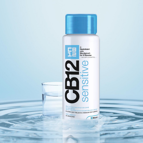 Die Bakterien produzieren dort flüchtige Schwefelverbindungen (VSC). Die entstehenden Gase sind dabei größtenteils für den Mundgeruch verantwortlich. Durch zu aggressive Mundhygiene, Zahnsteinbildungen oder Zahnfleischrückgang können die Dentinkanälchen an den Zähnen frei liegen. Ist dies der Fall, erzeugen Zugluft, Wärme, Kälte oder süßes bzw. saures Essen Reize, welche direkt an den Zahnnerv geleitet werden. Das kann zu ziehenden oder stechenden Schmerzen führen. CB12 Sensitive Mundspülung sorgt für frischen Atem bei sensiblen Zähnen und empfindlichen Zahnfleisch. Es hilft dabei, einen Schutzschild um freiliegende Dentinkanälchen aufzubauen, verleiht Ihnen Atemfrische und stärkt Ihren Zahnschmelz.