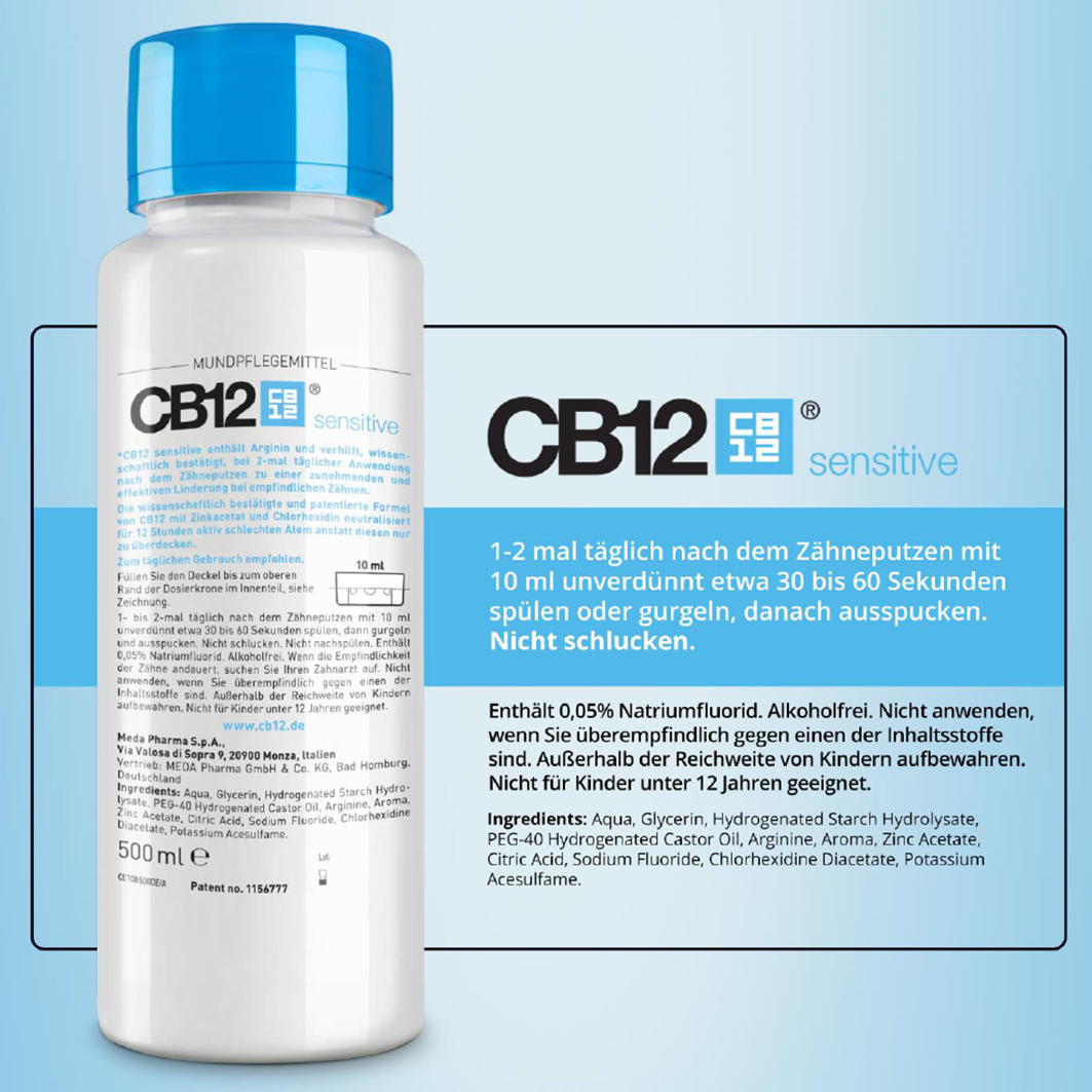 Bekämpfen Sie bei Mundgeruch die Ursache und schützen Sie mit der CB12 Sensitive Mundspülung gleichzeitig Ihre schmerzempfindlichen Zähne sowie Ihr sensibles Zahnfleisch. CB12 Sensitive bietet 3 Vorteile in einer Mundspülung:
