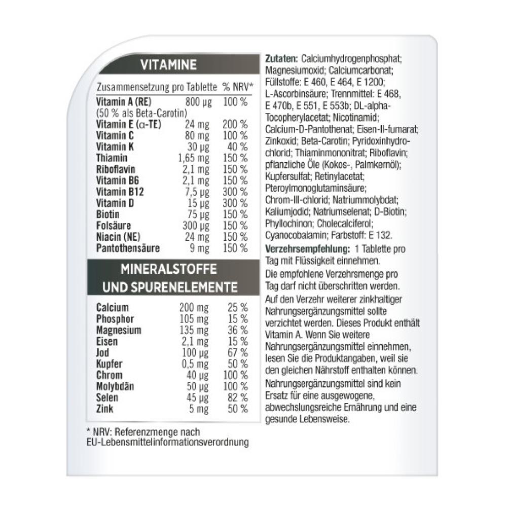 Calciumhydrogenphosphat; Magnesiumoxid; Calciumcarbonat; Füllstoffe: E 460, E 464, E 1200; L-Ascorbinsäure; Trennmittel: E 468, E 470b, E 551, E 553b; DL-alpha-Tocopherylacetat; Nicotinamid; Calcium-D-Pantothenat; Eisen-II-fumarat; Zinkoxid; Beta-Carotin; Pyridoxinhydrochlorid; Thiaminmononitrat; Riboflavin; pflanzliche Öle (Kokos-, Palmkernöl); Kupfersulfat; Retinylacetat; Pteroylmonoglutaminsäure; Chrom-III-chlorid; Natriummolybdat; Kaliumjodid; Natriumselenat; D-Biotin; Phyllochinon; Cholecalciferol; Cyanocobalamin; Farbstoff: E 132.