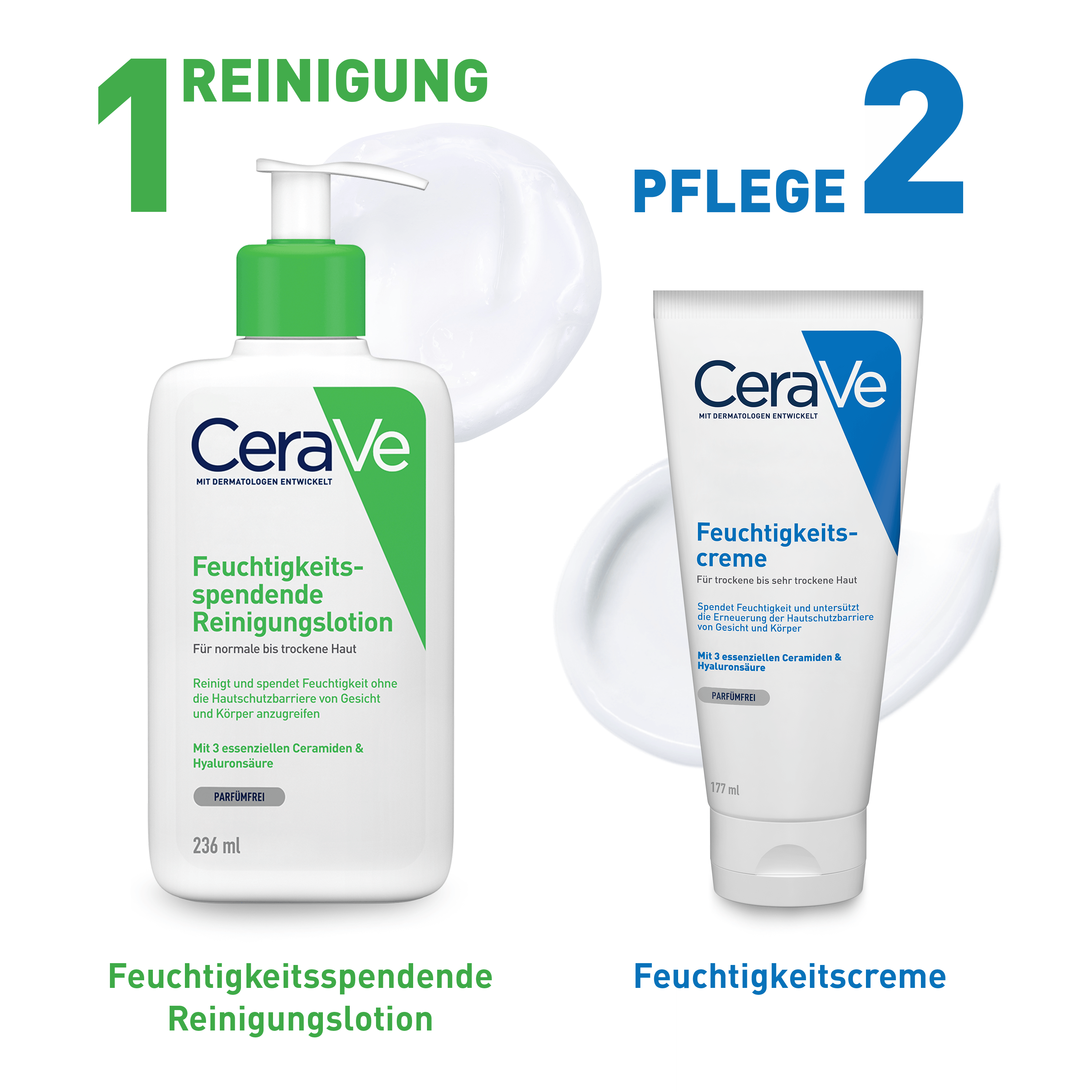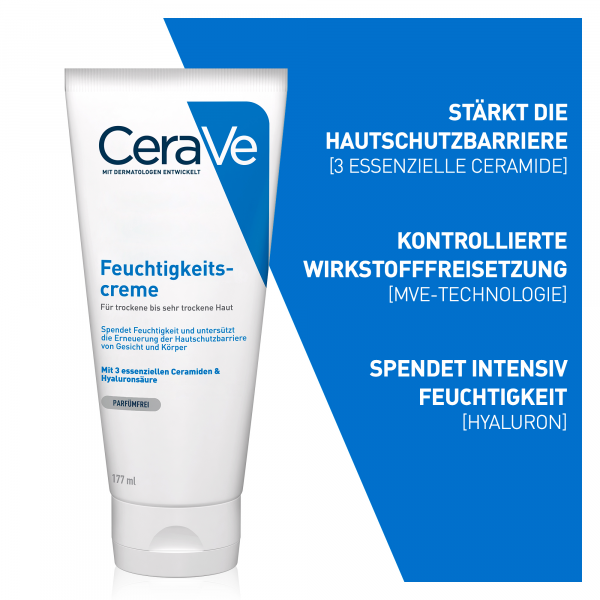 Reichhaltige Feuchtigkeitspflege für die ganze Familie Die CeraVe Feuchtigkeitscreme für Gesicht und Körper hydratisiert die Haut, beugt Austrocknung vor und stärkt die Hautschutzbarriere. CeraVe Feuchtigkeitscreme für trockene bis sehr trockene Haut Die Hautpflege zeichnet sich durch ihre patentierte MVE-Wirkstoff-Freisetzung aus, die die aktiven Wirkstoffe über den Tag verteilt freisetzt. Dank Hyaluron und drei essenziellen Ceramiden wird die Haut kontinuierlich mit Feuchtigkeit versorgt und die natürliche Hautschutzbarriere gestärkt – für ein angenehm weiches Hautgefühl. Die CeraVe Feuchtigkeitscreme enthält keine Dufstoffe und eignet sich auch bei Neurodermitis und für Allergiker.