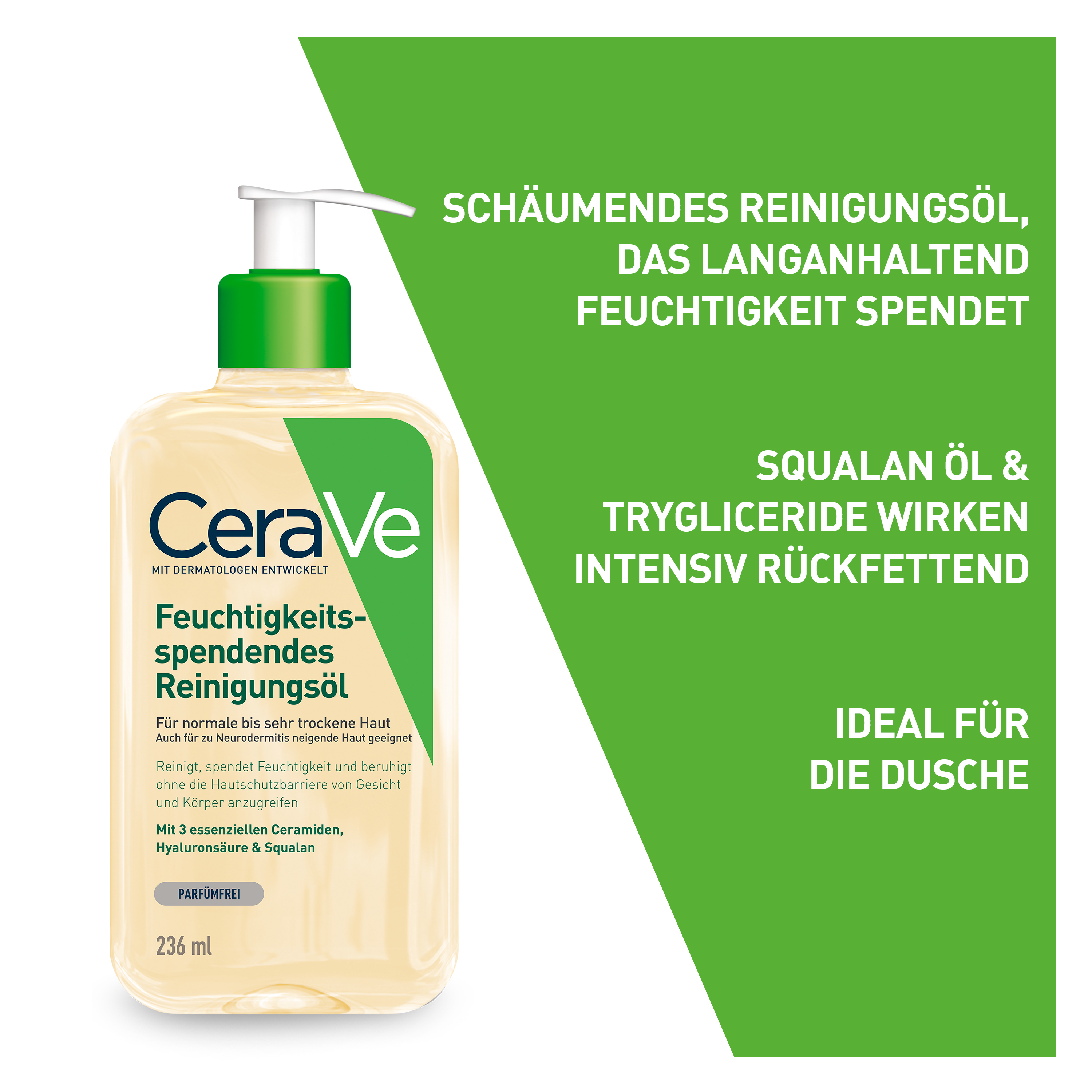 Reinigungsöl für normale bis sehr trockene Haut von Körper und Gesicht Das schäumende Reinigungsöl von CeraVe reinigt die Haut effektiv, spendet wertvolle Feuchtigkeit und schützt die natürliche Hautschutzbarriere. CeraVe Feuchtigkeitsspendendes Reinigungsöl ohne Duftstoff und Seife Die mit Dermatologen entwickelte Formel enthält rückfettendes Squalan, Triglyceride sowie Ceramide, die die Haut bereits ab der ersten Anwendung regenerieren und mit Feuchtigkeit versorgen. Der samtige Schaum, der beim Auftragen entsteht, entfernt selbst hartnäckiges Make-up und Schmutz, ohne die Haut auszutrocknen. Es eignet sich für die ganze Familie, für Allergiker sowie für zu Neurodermitis neigende Haut.