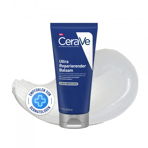Der CeraVe Ultra Reparierender Balsam mit Hyaluronsäure und den 3 essenziellen Ceramiden schützt und beruhigt raue und trockene Haut sofort. Der Balsam sorgt für eine schnelle Regeneration der Hautschutzbarriere.