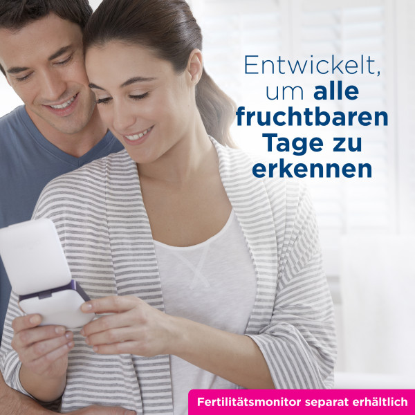 Der Clearblue Fertilitätsmonitor Advanced (nicht enthalten, separat erhältlich) erhöht nachweislich die Chancen, auf natürliche Weise schwanger zu werden, um 89 %.1 Er zeichnet sich dadurch aus, alle Ihre fruchtbaren Tage zu erkennen. Dies sind in der Regel bis zu 6 Tage und daher mehr als bei allen anderen Eisprung-Vorhersage-Kits, die nur das LH messen. Er ist tragbar, verfügt über ein dezentes und feminines Design und misst die zwei wesentlichen Fruchtbarkeitshormone: Östrogen und das luteinisierende Hormon. Ihre Fruchtbarkeitsinformationen werden auf dem benutzerfreundlichen Touchscreen angezeigt und die Daten von bis zu 6 Zyklen werden in der Zyklusübersicht zusammengefasst, um diese mühelos vergleichen zu können.