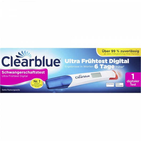 Das Clearblue Schwangerschaftstest Ultra Frühtest Digital Kit kombiniert eine ultrasensitive Früherkennung des Schwangerschaftshormons mit eindeutigen digitalen Ergebnissen in Worten. Unser empfindlichster digitaler Schwangerschaftstest kann bis zu sechs Tage vor dem Ausbleiben der Periode angewendet werden.1 Die Empfindlichkeit des Tests liegt bei 10 mIU/ml. Das Testen wird durch eine besonders breite Testspitze und durch das einzigartiges Stopp-Licht vereinfacht, dies blinkt, wenn ausreichend Urin von der Testspitze aufgenommen wurde. Darüber hinaus trägt unsere Floodguard-Technologie zu einer deutlichen Verringerung von Benutzerfehlern bei. 2 Sobald der Test läuft, wird der Smart Countdown auf dem Display angezeigt, um zu bestätigen, dass der Test auswertet, und um die Zeit bis zu Ihrem eindeutigen digitalen Ergebnis in Worten anzuzeigen, das innerhalb von 1–5 Minuten erscheint. Wie alle Clearblue Schwangerschaftstests ist auch der Ultra Frühtest Digital zu über 99 % zuverlässig bei der Erkennung einer Schwangerschaft, wenn der Test ab dem Fälligkeitstag Ihrer Periode verwendet wird.