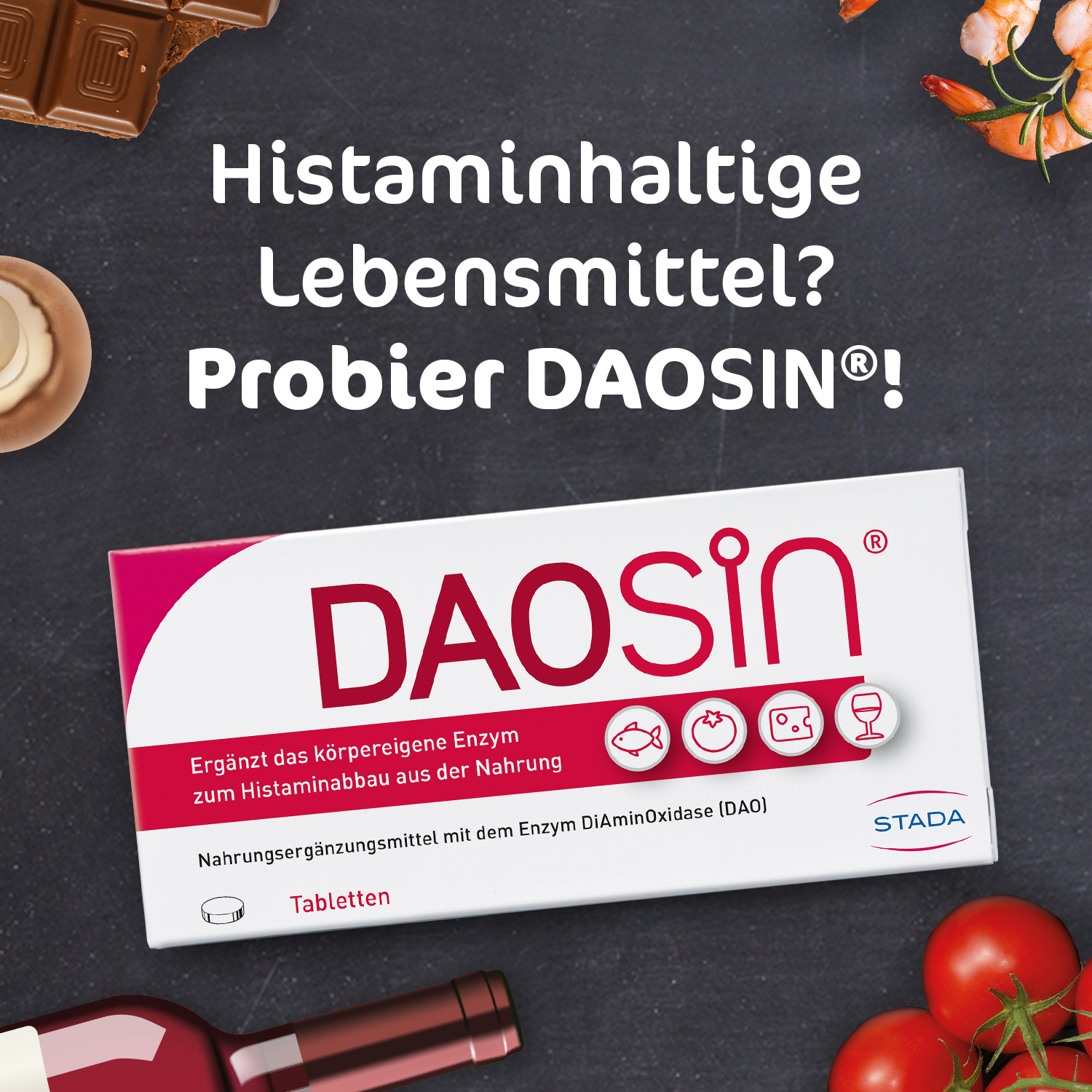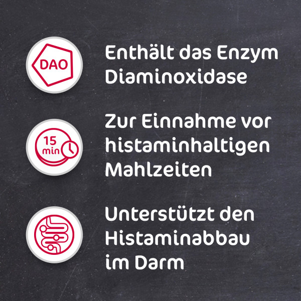 Daosin® unterstützt den Körper beim Abbau von Histamin aus der Nahrung. Durch die Einnahme von DAOSiN® Tabletten vor der Mahlzeit kann die DAO-Menge im Dünndarm erhöht werden und im Verdauungstrakt ein ausreichender Abbau von Histamin aus der Nahrung erzielt werden.