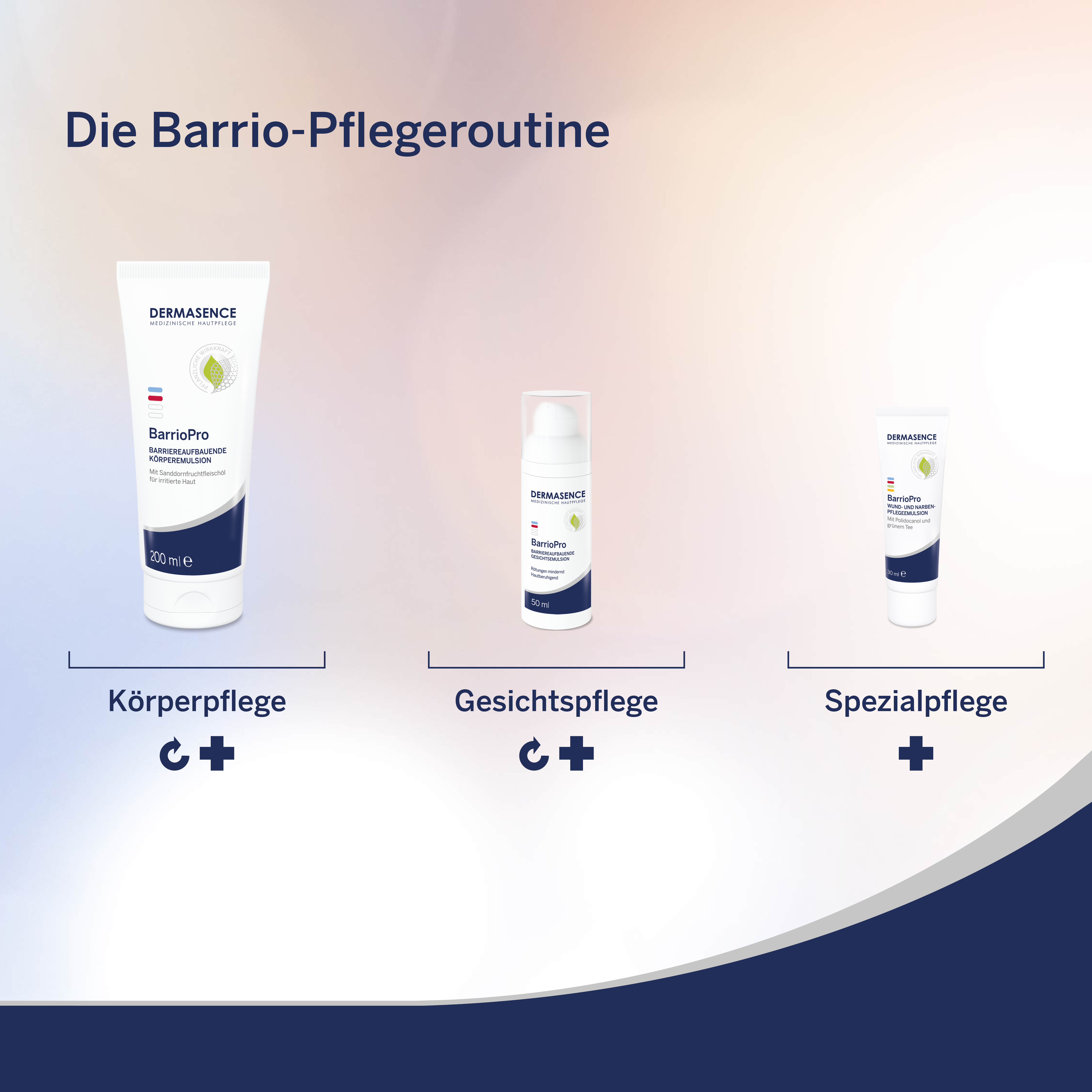 Zur sanften Reinigung für Gesicht und Körper empfehlen wir DERMASENCE BarrioPro anti-irritativer Reinigungsschaum und für die tägliche Gesichtspflege DERMASENCE BarrioPro Emulsion .
