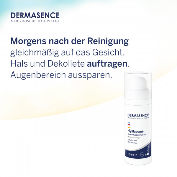 Die DERMASENCE Hyalusome Tagespflege mit LSF 50 ist eine leichte Anti-Aging-Tagespflege, die einen hohen Zellschutz und wertvolle Feuchtigkeit bietet. Hyaluron und Q10 glätten Mimikfalten effektiv und bewahren die Haut vor oxidativem Stress. Die parfümfreie Tagespflege enthält einen hohen Lichtschutzfaktor, der vor der Entstehung von sonnenbedingten Hautschäden und Pigmentflecken schützt. Vorzeitiger Hautalterung und insbesondere Faltenbildung wird so vorgebeugt. Die angenehme Textur fettet nicht und hinterlässt ein angenehmes Hautgefühl.Anwendung: Morgens nach der gründlichen Reinigung auf das Gesicht, Hals und Dekolletee auftragen und gleichmäßig verteilen. Den Augenbereich aussparenDosierung: eine ausreichende Menge