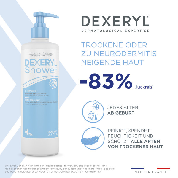 DEXERYL® Shower Duschcreme in der 500-Milliliter-Variante ist speziell für die tägliche Reinigung von trockener Haut entwickelt. Die Duschcreme bietet eine schonende Reinigung und intensive Feuchtigkeitsversorgung, um Hautirritationen und Trockenheit entgegenzuwirken. Sie ist hypoallergen sowie parfüm- und seifenfrei und eignet sich somit hervorragend für die ganze Familie, einschließlich Babys und Kinder.