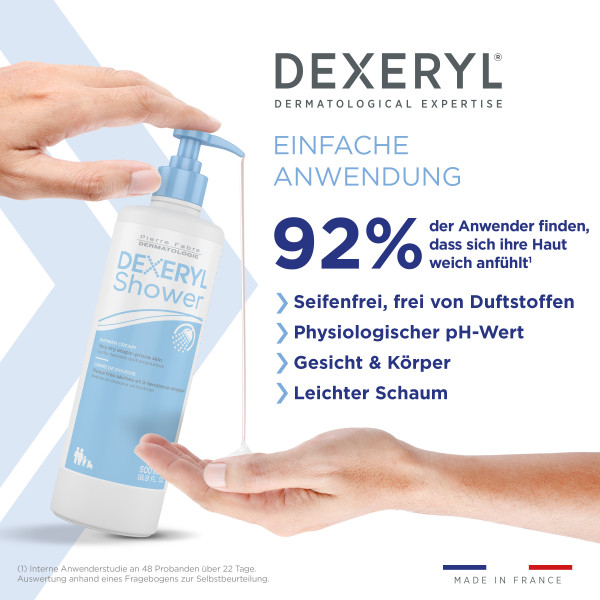 Trage eine angemessene Menge DEXERYL® Shower Duschcreme auf die feuchte Haut auf. Massiere sie sanft ein und spülen sie anschließend gründlich ab. Die Duschcreme ist für die tägliche Anwendung geeignet und kann von der ganzen Familie verwendet werden.