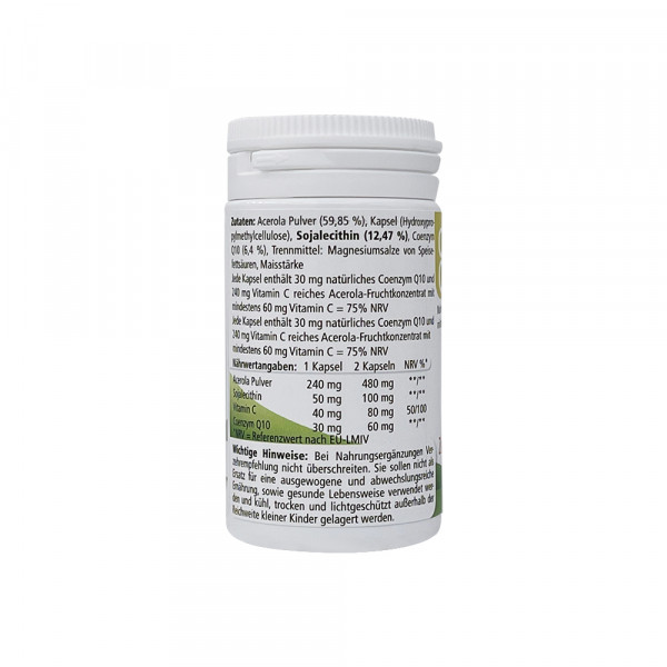 Zusammensetzung/Kapsel: Acerola-Fruchtpulver, Kapselmaterial Cellulose, Sojalecithin, Coenzym Q10 (30 mg), Trennmittel: Magnesiumsalze von Speisefettsäuren, Maisstärke