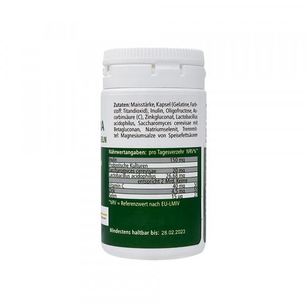 Maisstärke, Kapsel (Gelatine, Farbstoff: Titandioxid), Inulin, Oligofructose, Ascorbinsäure (C), Zinkgluconat, Lactobacillus acidophilus, Saccharomyces cerevisae mit Betagluconan, Natriumselenat, Trennmittel: Magnesiumsalze von Speisefettsäuren