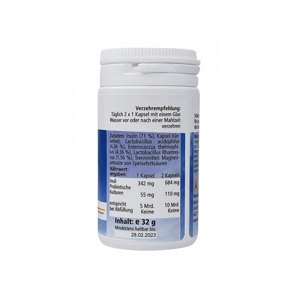 Inulin (71 %), Kapsel (Gelatine), Lactobacillus acidophilus (4,36 %), Enterococcus thermophilus (4,36 %), Lactobacillus Rhamnosus (1,56 %), Trennmittel: Magnesiumsalze von Speisefettsäuren