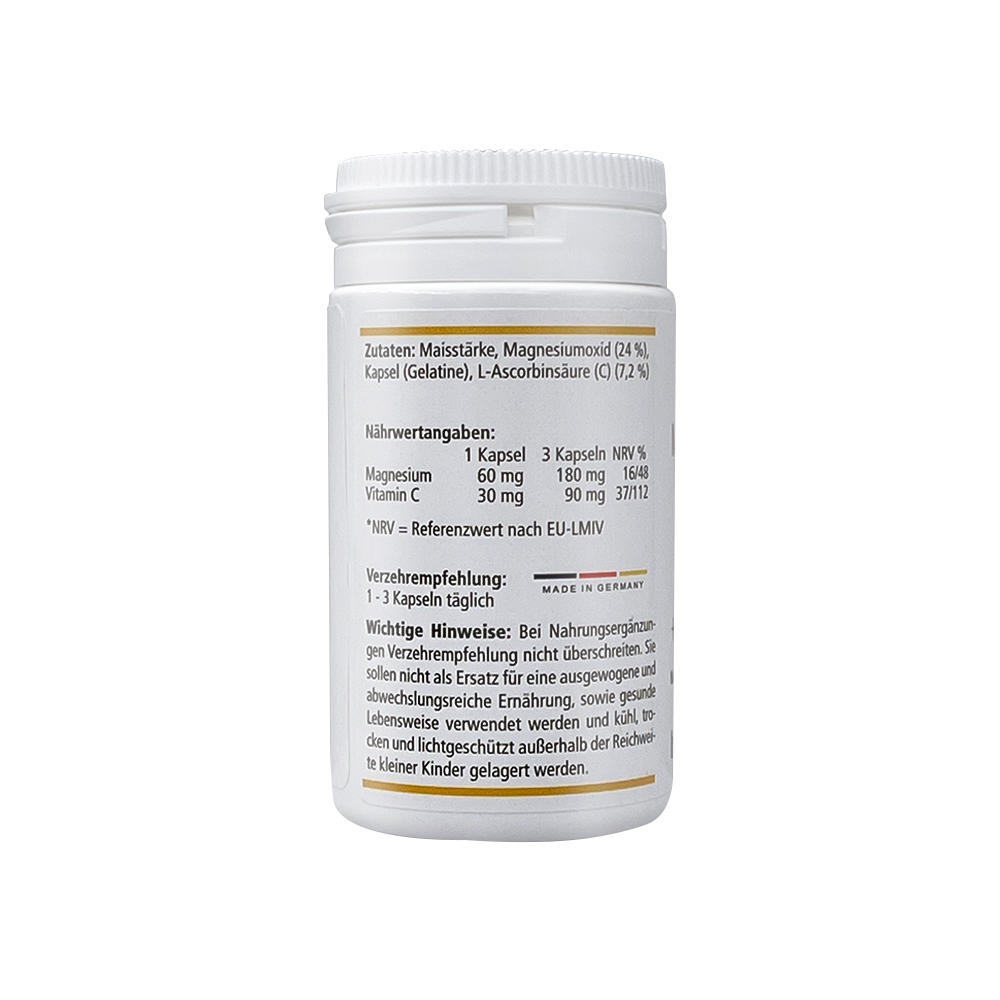 Zusammensetzung/Kapsel: Maisstärke, Magnesiumoxid (24 %), Kapsel (Gelatine), L-Ascorbinsäure (C) (7,2 %)