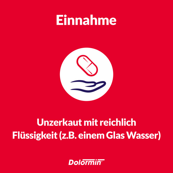 Dolormin® Extra sind kapselförmige Filmtabletten mit einer Bruchkerbe, wodurch die Filmtabletten einfach in zwei gleiche Hälften geteilt werden können. Dolormin® Extra sollte unzerkaut mit reichlich Flüssigkeit, zum Beispiel einem Glas Wasser, eingenommen werden. Bei einem empfindlichen Magen, kann Dolormin® Extra während der Mahlzeiten eingenommen werden.