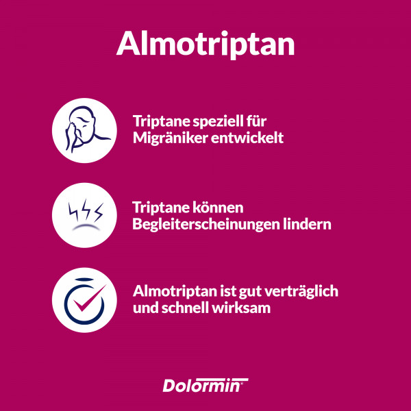 Hier hilft Dolortriptan®. Dank des Wirkstoffs Almotriptan, lindert Dolortriptan® schnell und andauernd Migränekopfschmerzen und Begleiterscheinungen.