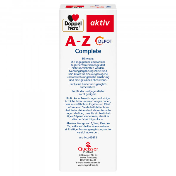 DoppelherzNahrungsergänzungsmittel sind kein Ersatz für eine ausgewogene und abwechslungsreiche Ernährung und eine gesunde Lebensweise. Die angegebene empfohlene tägliche Verzehrsmenge darf nicht überschritten werden. Außerhalb der Reichweite von kleinen Kindern aufbewahren.