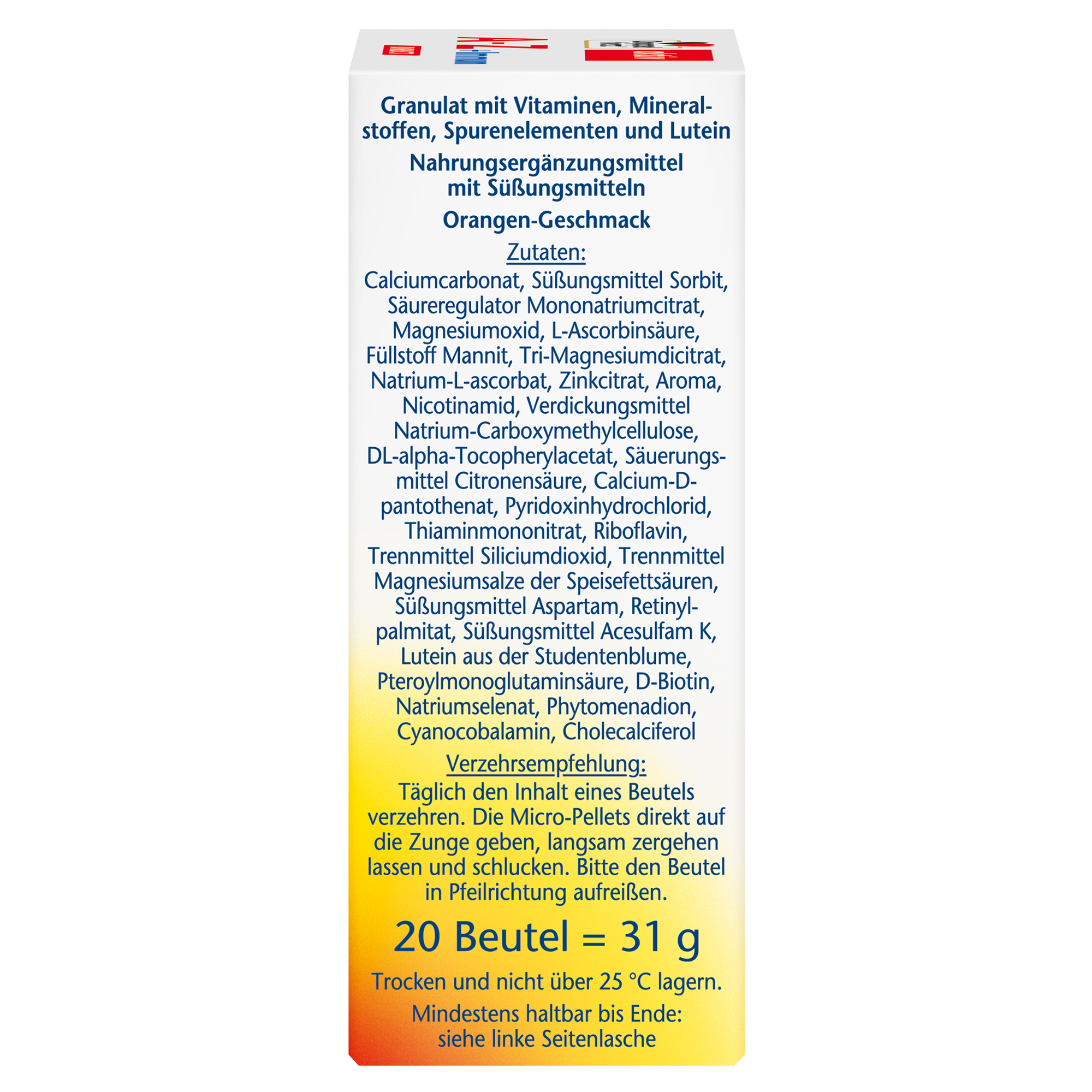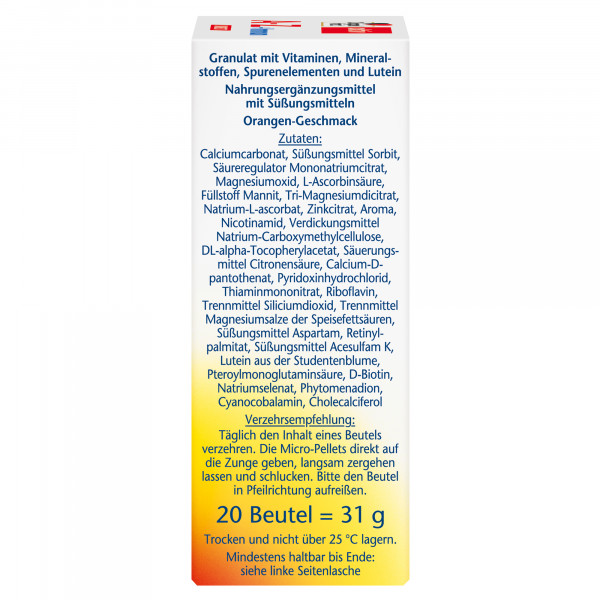 Calciumcarbonat, Süßungsmittel Sorbit, Säureregulator Mononatriumcitrat, Magnesiumoxid, L-Ascorbinsäure, Füllstoff Mannit, Tri-Magnesiumdicitrat, Natrium-L-ascorbat, Zinkcitrat, Aroma, Nicotinamid, Verdickungsmittel Natrium-Carboxymethylcellulose, DL-alpha-Tocopherylacetat, Säuerungsmittel Citronensäure, Calcium-D-pantothenat, Pyridoxinhydrochlorid, Thiaminmononitrat, Riboflavin, Trennmittel Siliciumdioxid, Trennmittel Magnesiumsalze der Speisefettsäuren, Süßungsmittel Aspartam, Retinylpalmitat, Süßungsmittel Acesulfam K, Lutein aus der Studentenblume, Pteroylmonoglutaminsäure, D-Biotin, Natriumselenat, Phytomenadion, Cyanocobalamin, Cholecalciferol