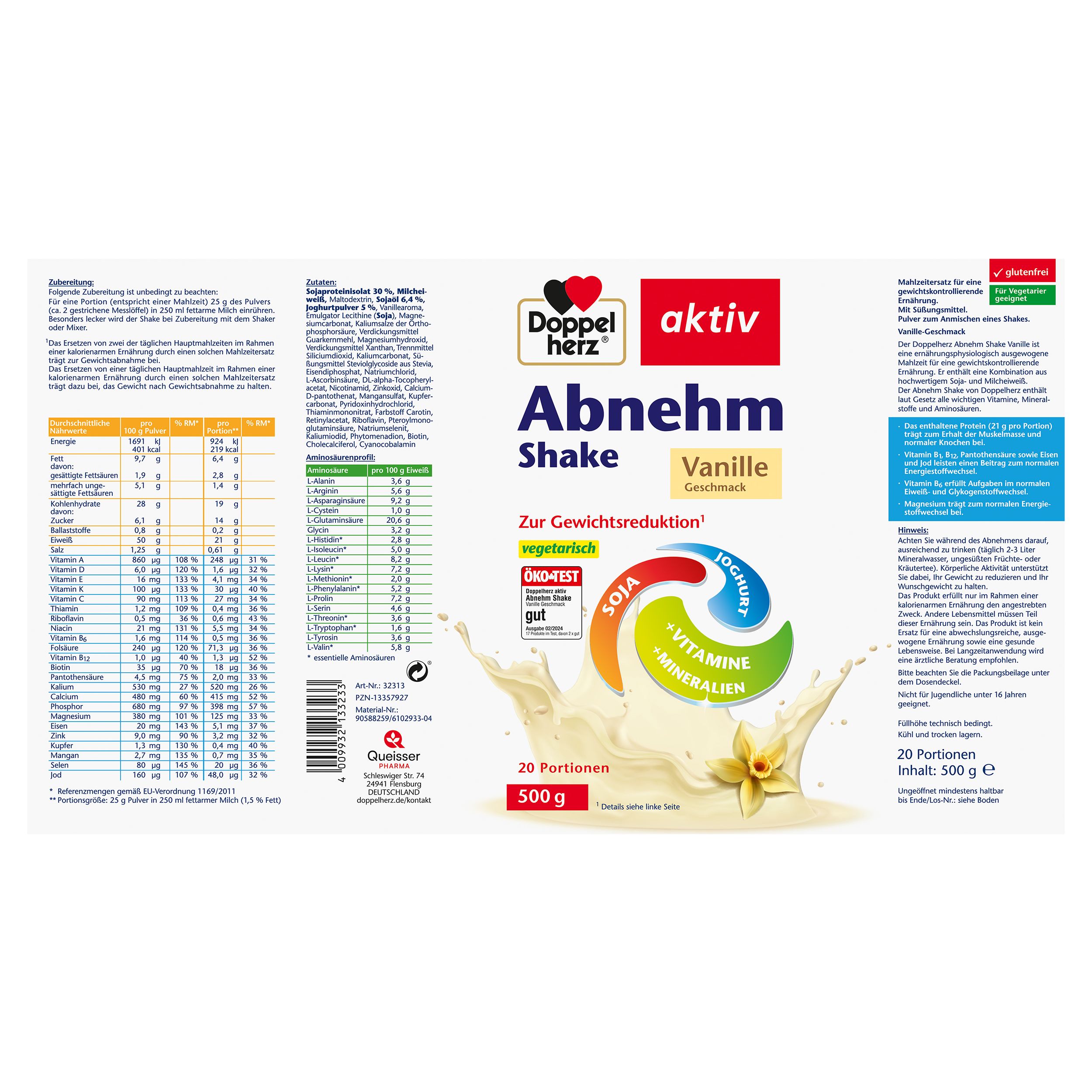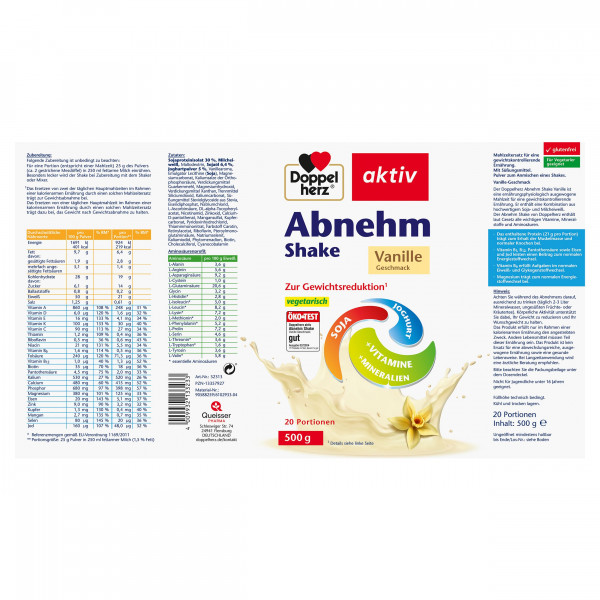 Bei dem Abnehm Shake handelt es sich um eine ernährungsphysiologisch ausgewogene Mahlzeit für eine gewichtskontrollierende Ernährung. Er enthält eine Kombination aus hochwertigem Soja- und Milcheiweiß. Das enthaltene Eiweiß (21 g pro Portion) trägt zum Erhalt der Muskelmasse und normaler Knochen bei. Der Abnehm Shake enthält laut Gesetz alle wichtigen Vitamine, Mineralstoffe und Aminosäuren. Die Vitamine B1, B12, Pantothensäure sowie Eisen und Jod leisten einen Beitrag zum normalen Energiestoffwechsel. Vitamin B6 erfüllt Aufgaben im normalen Eiweiß- und Glykogenstoffwechsel. Magnesium trägt zum normalen Energiestoffwechsel bei. Für die Gewichtskontrolle: Das Ersetzen von einer täglichen Hauptmahlzeit im Rahmen einer kalorienarmen Ernährung durch den Doppelherz Abnehm Shake trägt dazu bei, das Gewicht nach Gewichtsabnahme zu halten. Für die Gewichtsabnahme: Das Ersetzen von zwei der täglichen Hauptmahlzeiten im Rahmen einer kalorienarmen Ernährung durch einen solchen Mahlzeitenersatz trägt zur Gewichtsabnahme bei. Bei der Entwicklung der Doppelherz Abnehm Shakes wurde sehr viel Wert auf den Geschmack gelegt. Besonders lecker wird der Shake mit Vanille-Geschmack bei der Zubereitung mit dem Shaker oder Mixer. Der Abnehm Shake ist speziell auf die Bedürfnisse einer nachhaltigen Gewichtskontrolle abgestimmt und unterstützt Sie dabei, schnell und effektiv Ihre Wunschfigur zu erreichen.Durch die schrittweise Umstellung Ihrer Lebensweise und die Integration einer abwechslungsreichen und ausgewogenen Ernährung sowie durch regelmäßige sportliche Aktivität halten Sie Ihr Wunschgewicht auch dauerhaft.