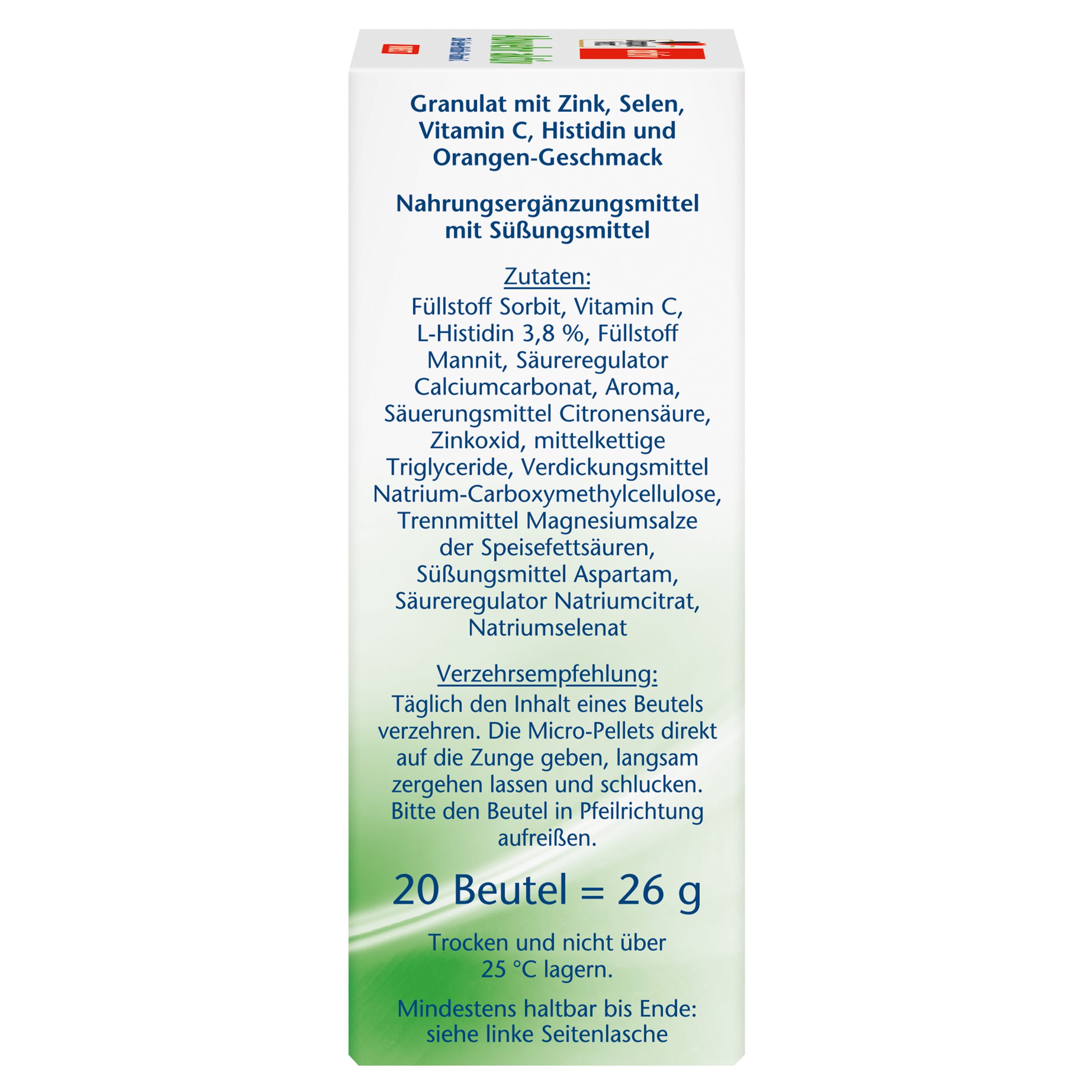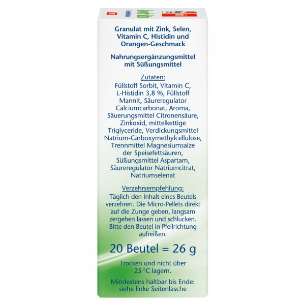 Füllstoff Sorbit, L-Ascorbinsäure, L-Histidin 3,8 %, Füllstoff Mannit, Säureregulator Calciumcarbonat, Aroma, Säuerungsmittel Citronensäure, Zinkoxid, mittelkettige Triglyceride, Verdickungsmittel Natrium-Carboxymethylcellulose, Trennmittel Magnesiumsalze der Speisefettsäuren, Süßungsmittel Aspartam, Säureregulator Natriumcitrat, Natriumselenat