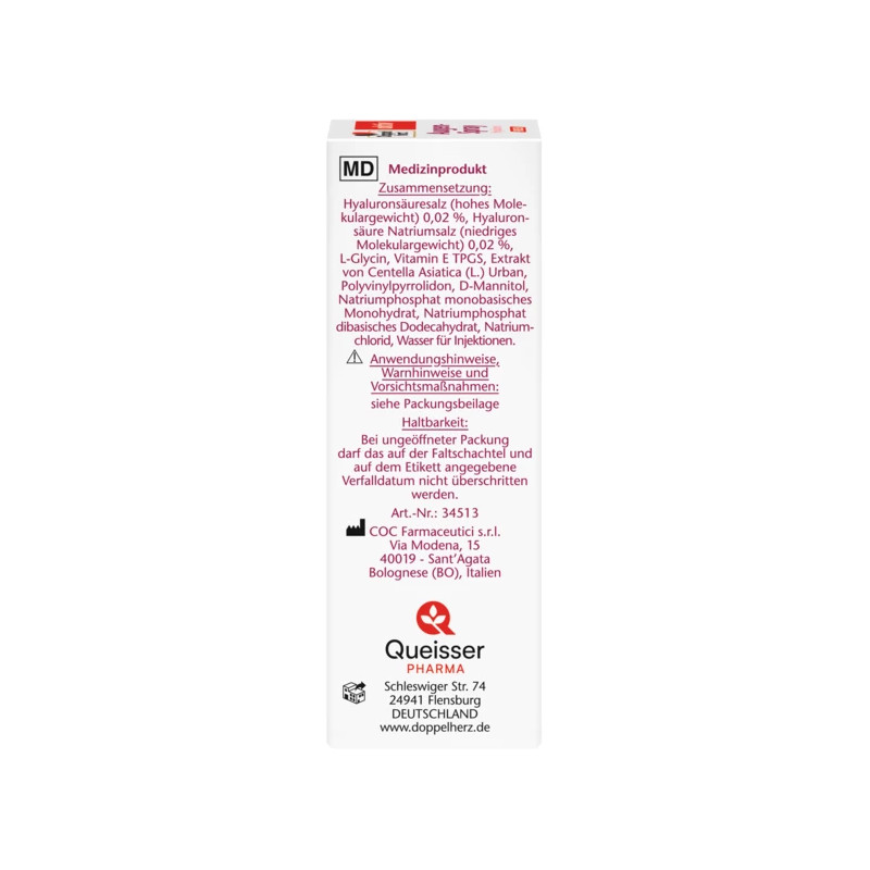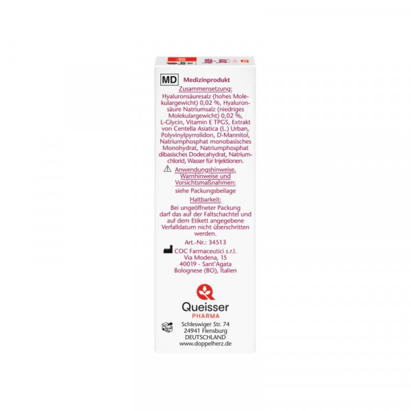 Hyaluronsäuresalz (hohes Molekulargewicht) 0,02 %, Hyaluronsäure Natriumsalz (niedriges Molekulargewicht) 0,02 %, L-Glycin, Vitamin E TPGS, Extrakt von Centella Asiatica (L.) Urban, Polyvinylpyrrolidon, D-Mannitol, Natriumphosphat monobasisches Monohydrat, Natriumphosphat dibasisches Dodecahydrat, Natriumchlorid, Wasser für Injektionen.
