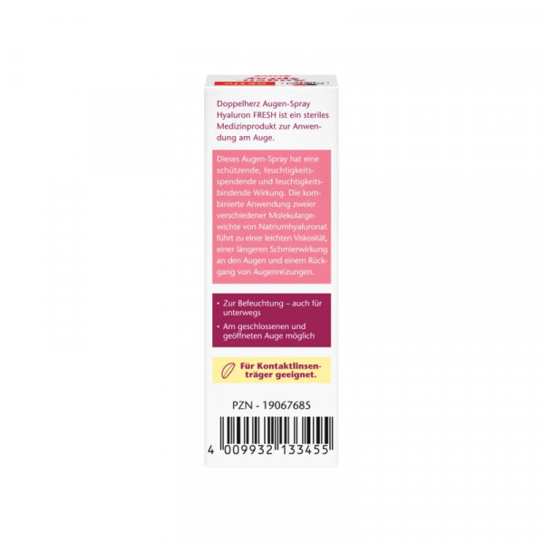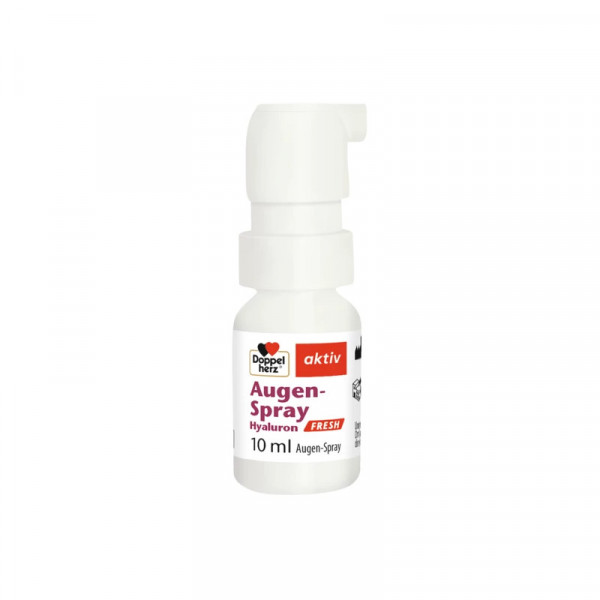 Doppelherz Augen-Spray Hyaluron FRESH ist ein steriles, konservierungsmittelfreies Medizinprodukt zur Anwendung am Auge. Seine Inhaltsstoffe kommen im Auge und im Tränenfilm auch auf natürliche Weise vor. Das Augen-Spray hat eine schützende, feuchtigkeitsspendende und feuchtigkeitsbindende Wirkung. Die kombinierte Anwendung zweier verschiedener Molekulargewichte von Natriumhyaluronat führt zu einer leichten Viskosität, einer längeren Schmierwirkung an den Augen und einem Rückgang von Augenreizungen.