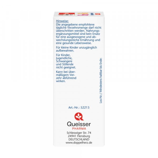 DoppelherzNahrungsergänzungsmittel sind kein Ersatz für eine ausgewogene und abwechslungsreiche Ernährung und eine gesunde Lebensweise. Die angegebene empfohlene tägliche Verzehrsmenge darf nicht überschritten werden. Außerhalb der Reichweite von kleinen Kindern aufbewahren.