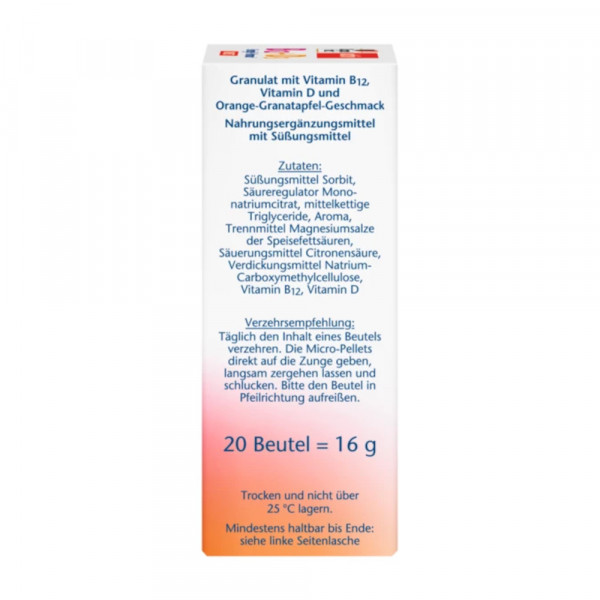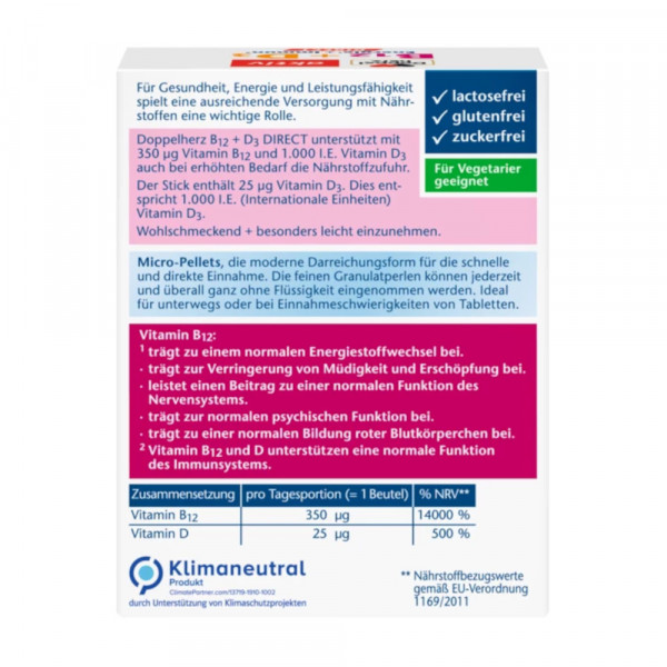 Doppelherz B12 + D3 DIRECT enthält Vitamin B12 für den Energiestoffwechsel und Vitamin D für die normale Funktion des Immunsystems. Ein Stick enthält 25 μg Vitamin D3. Dies entspricht 1.000 I.E. (Internationale Einheiten) Vitamin D3. Die Granulatperlen sind gluten- und lactosefrei.
