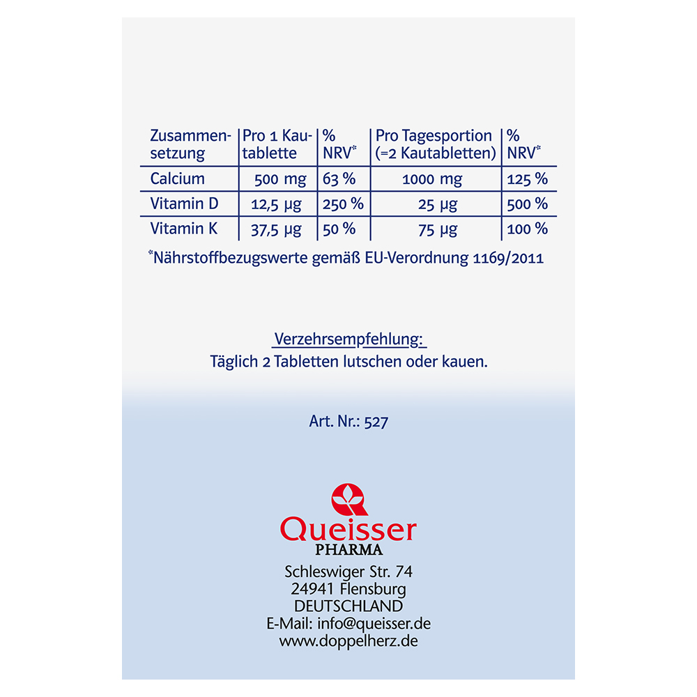 Die Kautabletten von Doppelherz system enthalten 1000 mg Calcium, 25 µg Vitamin D3 und 75 µg Vitamin K2 pro Tagesportion (= 2 Kautabletten) mit leckerem Orangen-Geschmack. Sie können jederzeit und an jedem Ort ganz ohne Flüssigkeit eingenommen werden. Diese Darreichungsform ist daher ideal für unterwegs oder bei Einnahmeschwierigkeiten von Tabletten. Mit Calcium, Vitamin D und Vitamin K tragen die Kautabletten von Doppelherz system zum Erhalt normaler Knochen bei. Calcium leistet einen Beitrag zur normalen Blutgerinnung und zum normalen Energiestoffwechsel. Der Mineralstoff unterstützt die normale Muskelfunktion. Vitamin D trägt zur normalen Aufnahme von Calcium und zu einem normalen Calciumspiegel im Blut bei. Zwei Kautabletten enthalten 25 µg Vitamin D. Dies entspricht 1000 I.E. (Internationale Einheiten) Vitamin D. Vitamin K leistet einen Beitrag zur normalen Blutgerinnung.
